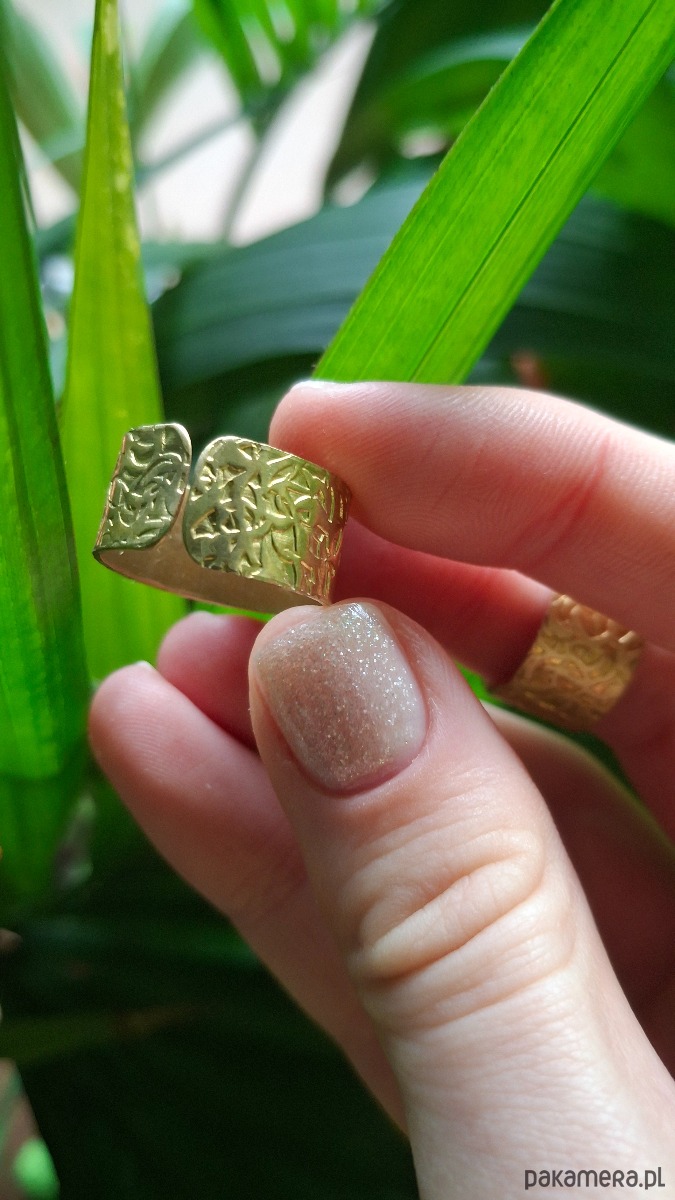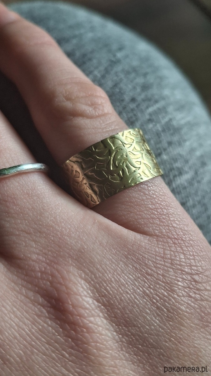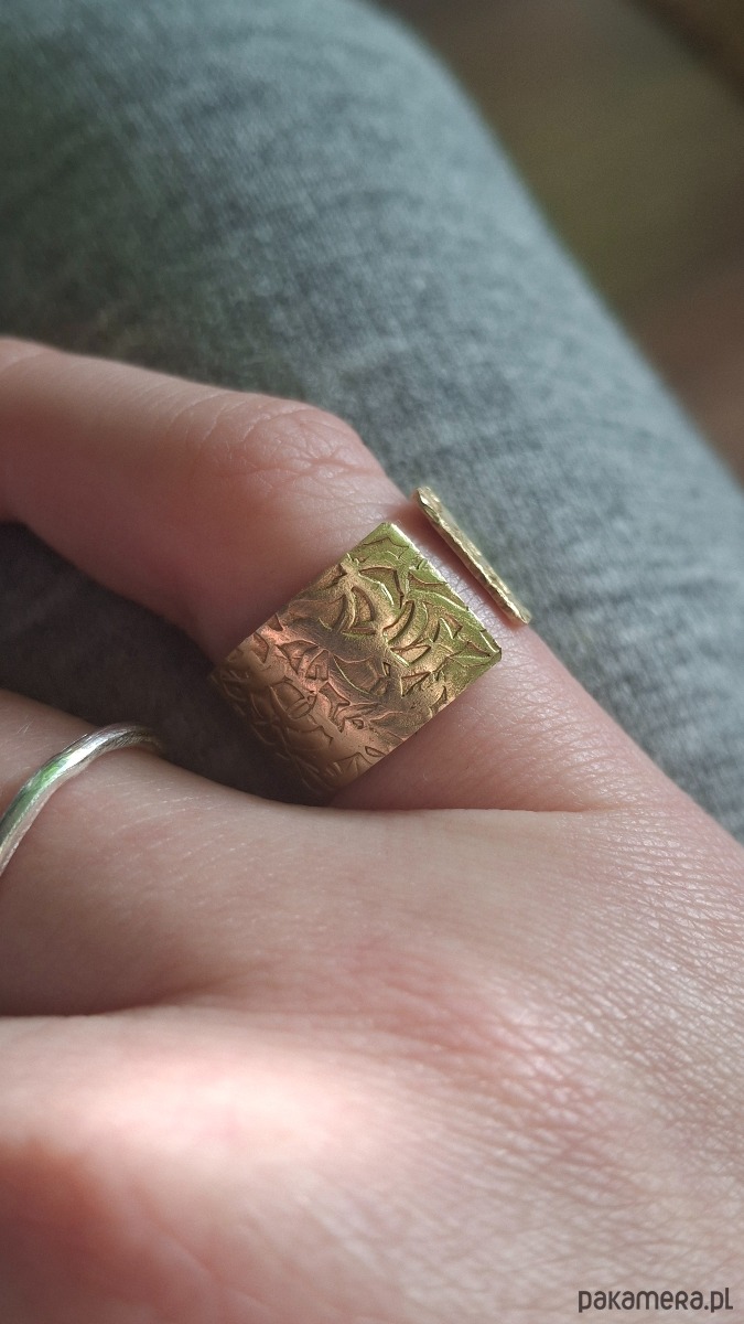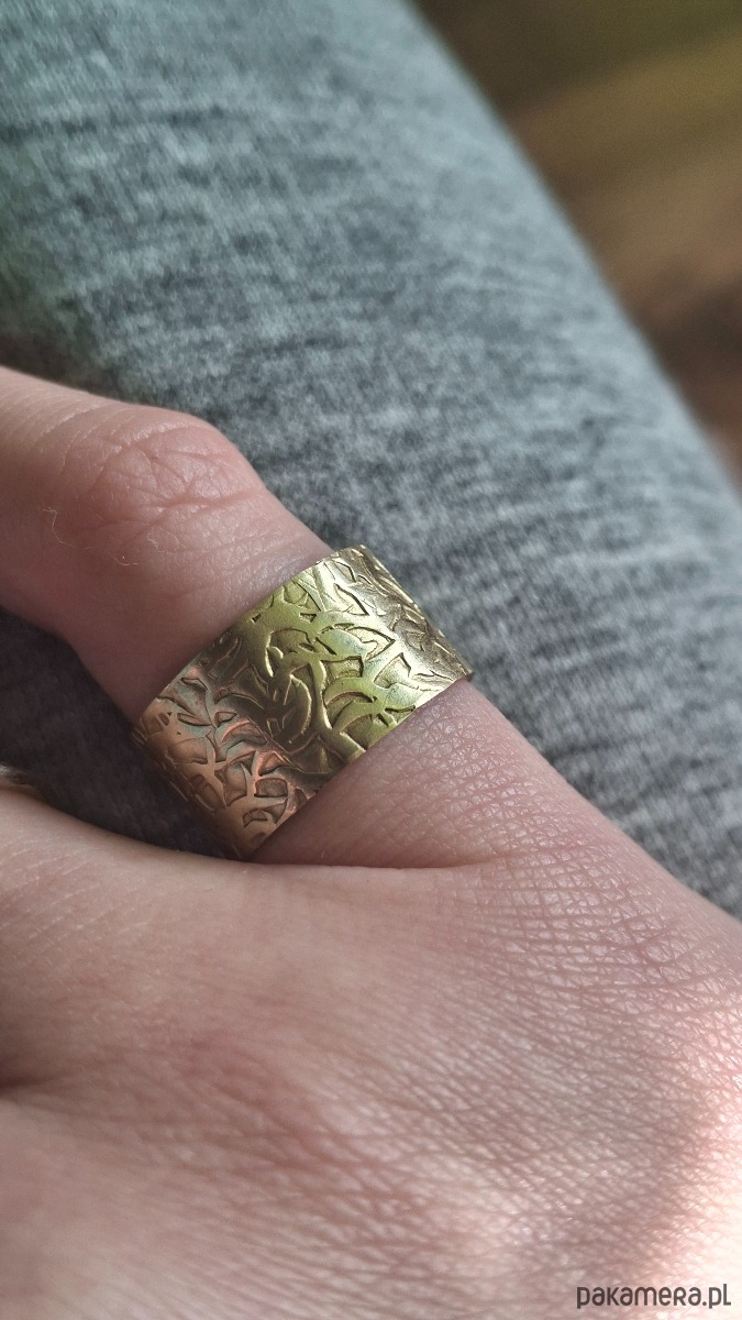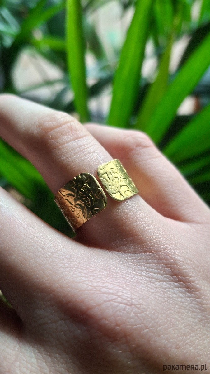 Elegancka, minimalistyczna obrączka wykonana z czystego mosiądzu, z zaokrąglonymi brzegami co powoduje, że jest bardzo komfortowa w noszeniu. Obrączka jest ozdobiona organicznymi rzeźbieniami. Rozmiar regulowany. Składając zamówienie koniecznie daj znać jaki rozmiar potrzebujesz, a wykonam ją specjalnie dla Ciebie.