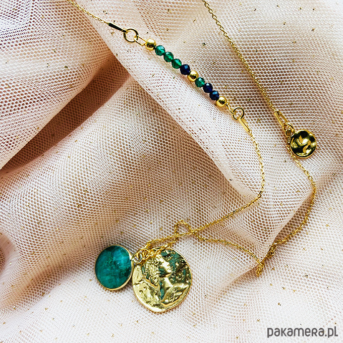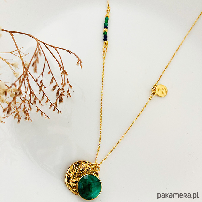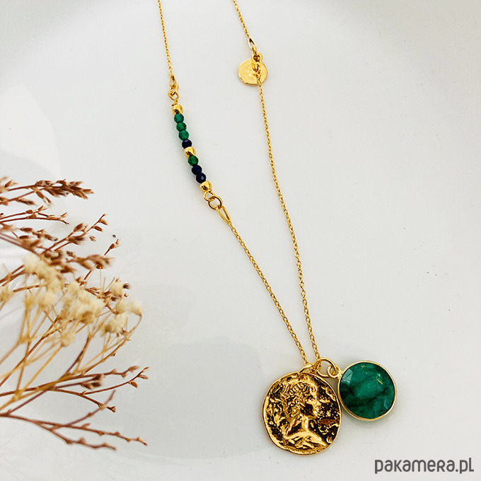 Emanujący czystą elegancją i wspaniałością skomponowany z efektownej zawieszki z motywem starożytnej monety, fasetowanego, oprawionego w srebro kamienia nefrytu, uzupełniony szmaragdami i szafirami na delikatnym łańcuszku.