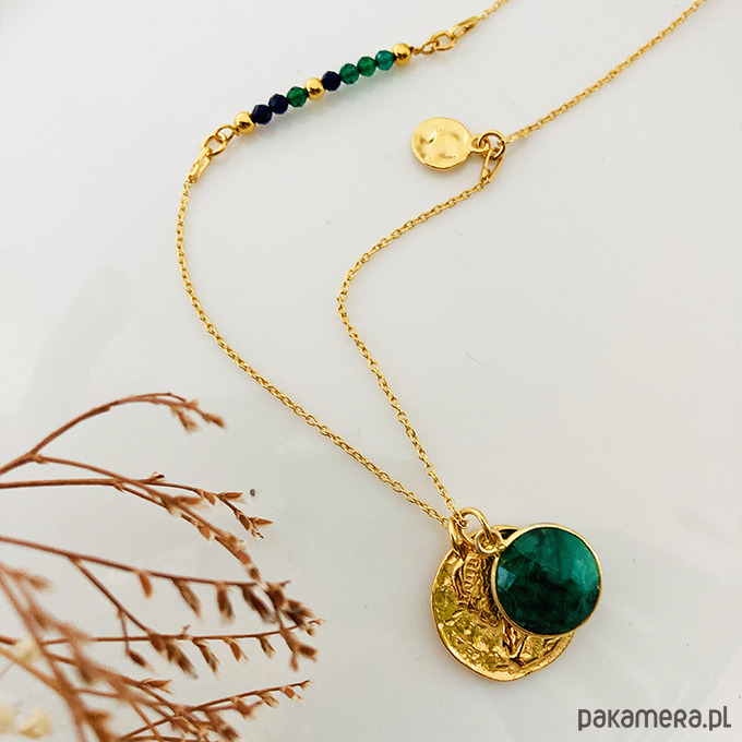 Wyjątkowo efektowny naszyjnik z fasetowanym oprawionym w srebro kamieniem nefrytem z zawieszką monetą, oraz szmaragdami i szafirami na łańcuszku. Elegancja i blask !