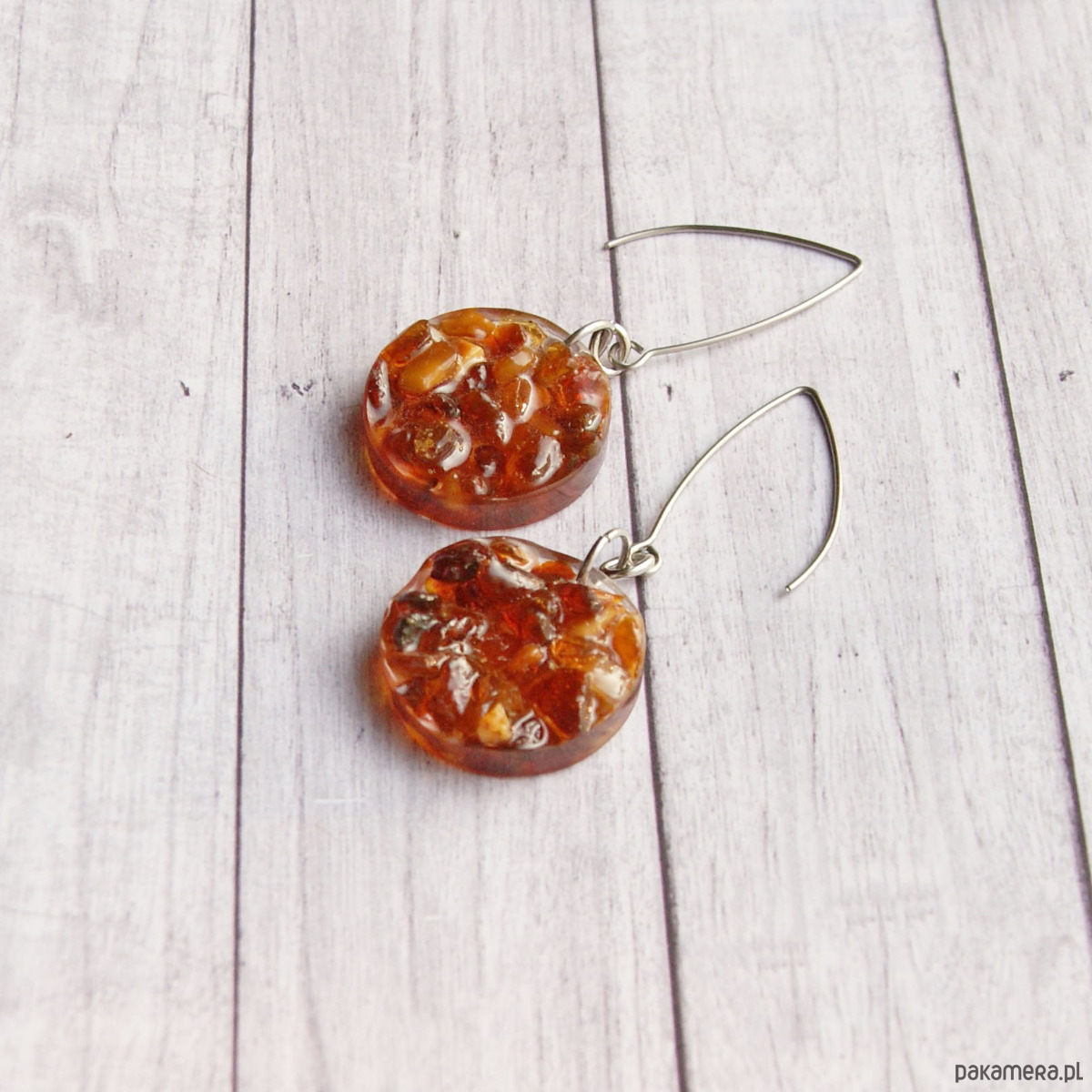 cudne, okazałe kolczyki wykonane z kawałków naturalnego bursztynu bałtyckiego zatopionych w żywicy.