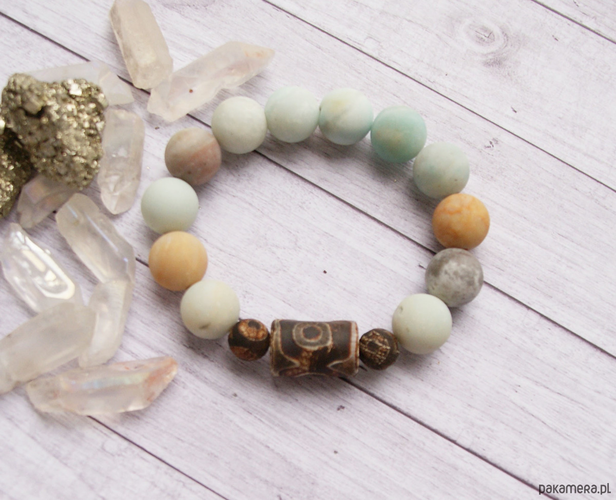 cudna, masywna i bardzo okazała bransoletka wykonana z AMAZONITU (duuuże, matowe kule 14mm) oraz pięknej bryłki agatu tybetańskiego (ok. 23mm) i kul trawionego agatu tybetańskiego 10mm.