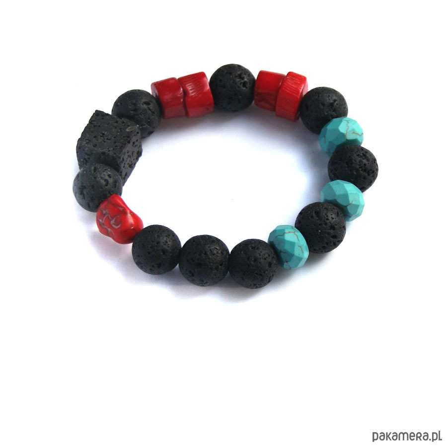 piękna, zjawiskowa, BARDZO MASYWNA bransoletka na solidnej, podwójnej lince elastycznej, wykonana z czarnej, porowatej lawy wulkanicznej (DUŻE KULE 14mm , kostki 16MM) oraz nieregularnych plastrów czerwonego korala, fasetowanych oponek turkusowego howlitu, głowy buddy (czerwony howlit), ; bez elementów metalowych.
