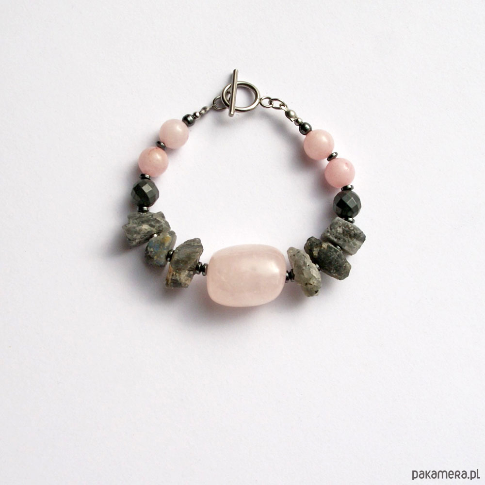 bransoleta na stalowej lince jubilerskiej. stworzona z różowego kwarcu (wielkość największej bryły : 24mm); plastrów surowego labradorytu, dodatków z hematytu. wygodne, ozdobne zapięcie toogle ze stali szlachetnej (nie uczula, kolor nie ściera się).