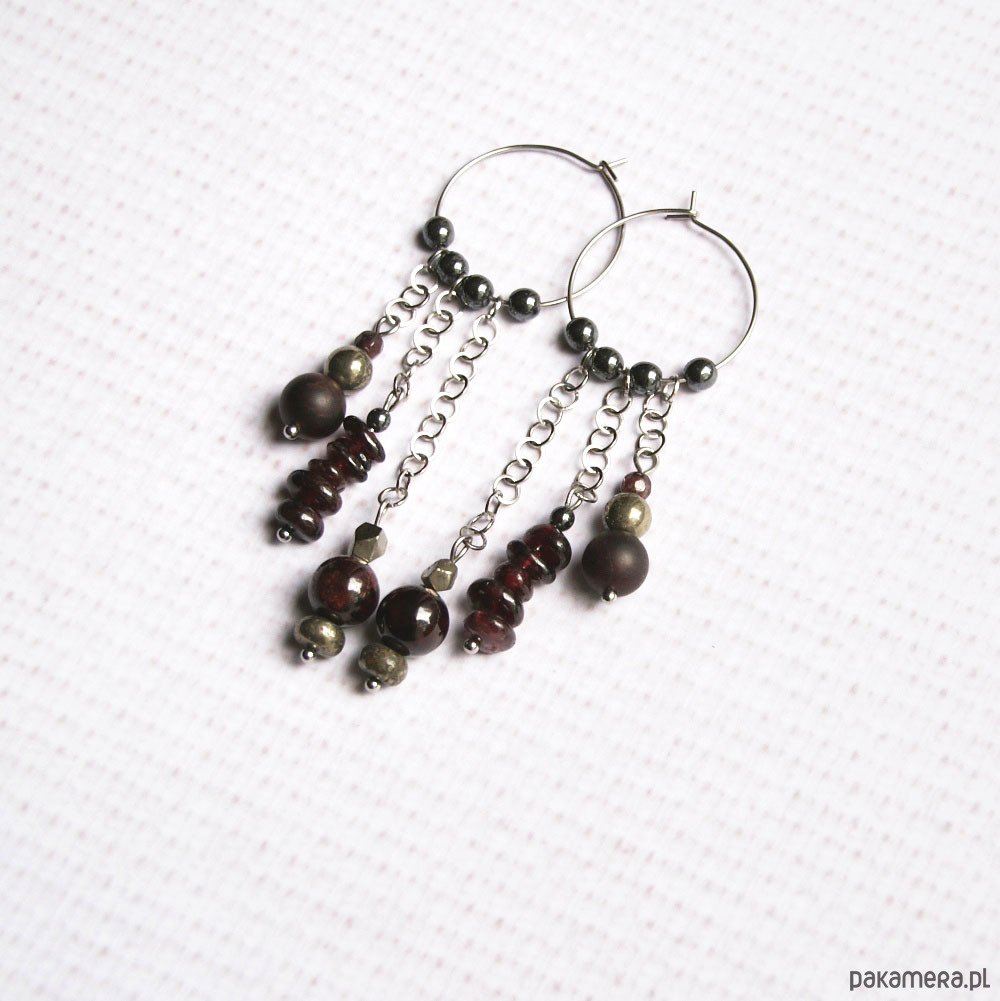 w roli głównej - starannie dobrane minerały w różnych formach (granat, piryt) , do tego bigle i łańcuszki ze stali szlachetnej oraz przekładki z hematytu.