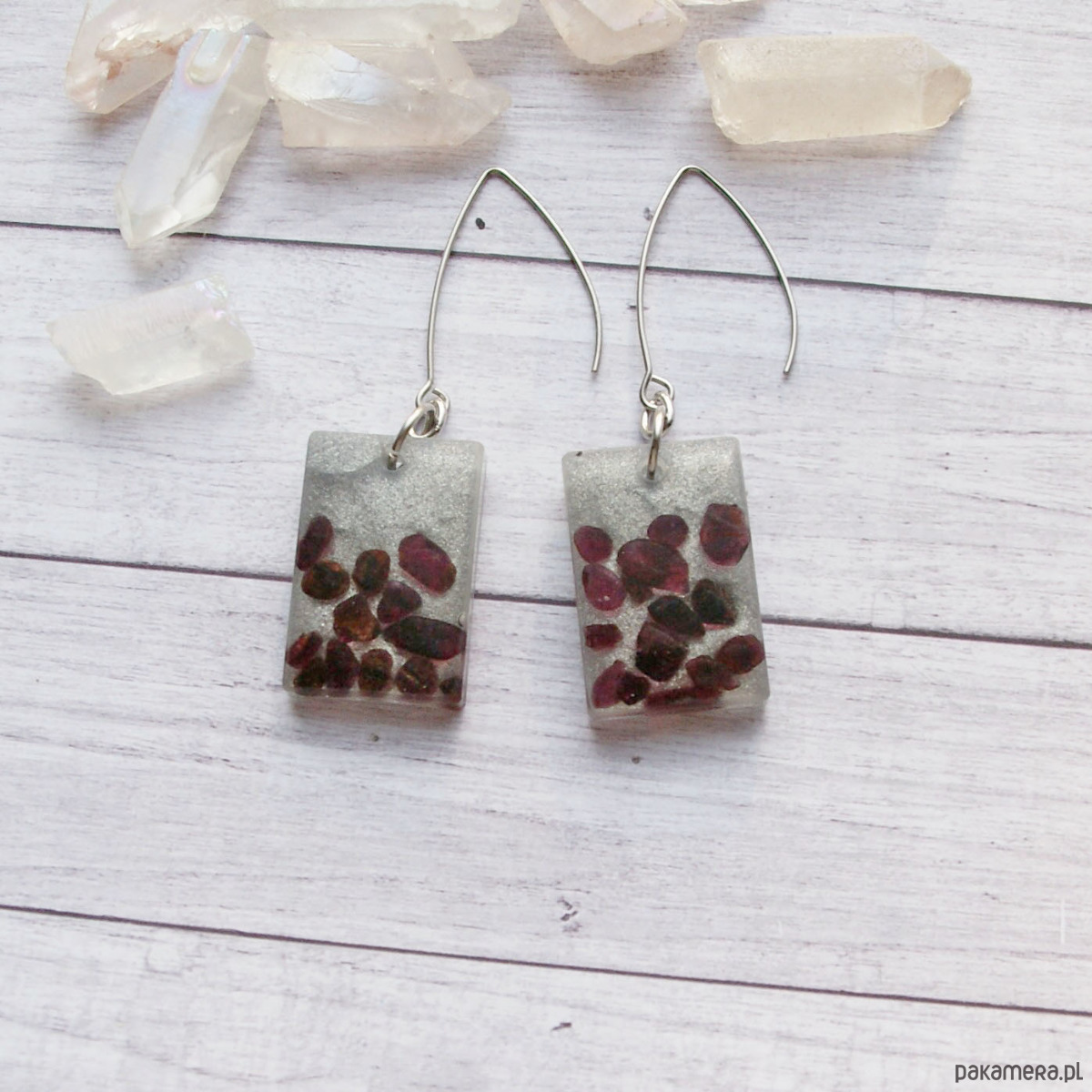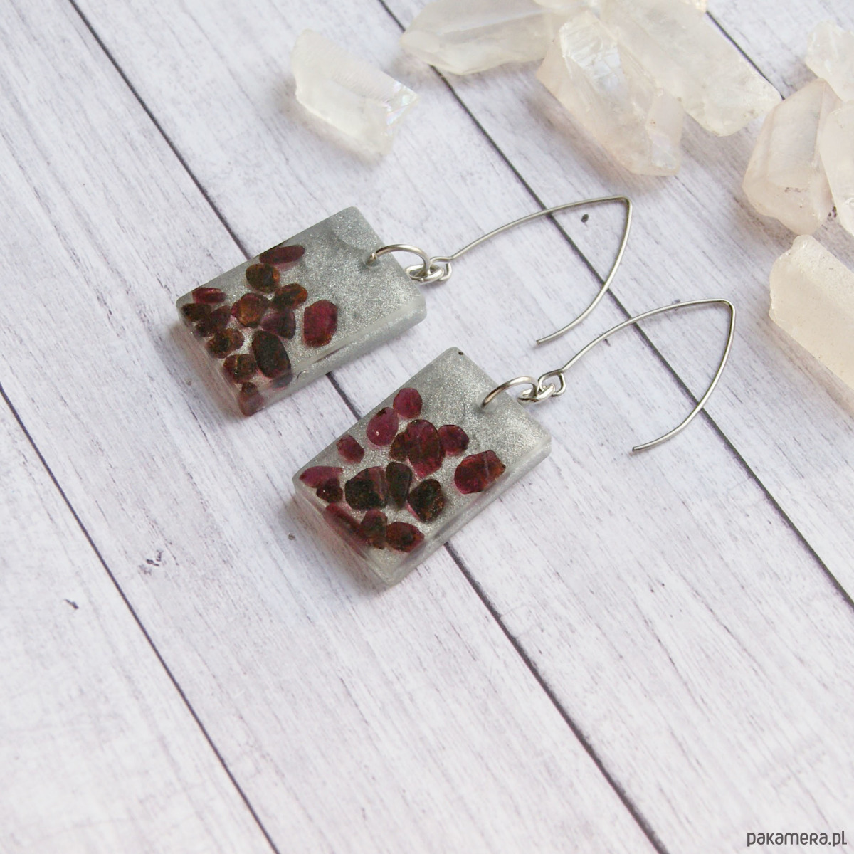 cudne, unikatowe kolczyki wykonane z kawałków naturalnego granatu zatopionych w żywicy.