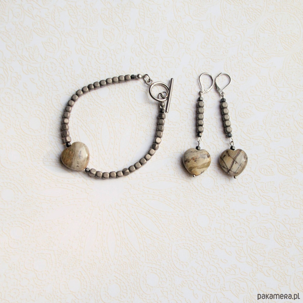 komplet wykonany z serc z jaspisu (18mm), matowego hematytu o ciekawym kształcie (soft cubes, 4mm), elementów metalowych wyłącznie ze stali szlachetnej (nie uczula, kolor nie ściera się).