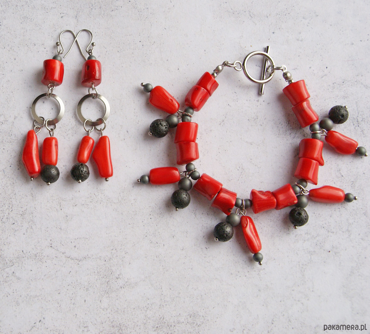 zjawiskowy, odważny komplet biżuterii wykonany, którego podstawę stanowi czerwony koral w kilku kształtach. dla kontrastu dodałam kilcza kuleczek czarnej lawy oraz matowego hematytu. wszystkie elementy metalowe WYKONANE W CAŁOŚCI ZE STALI SZLACHETNEJ (nie uczula, kolor nie ściera się).