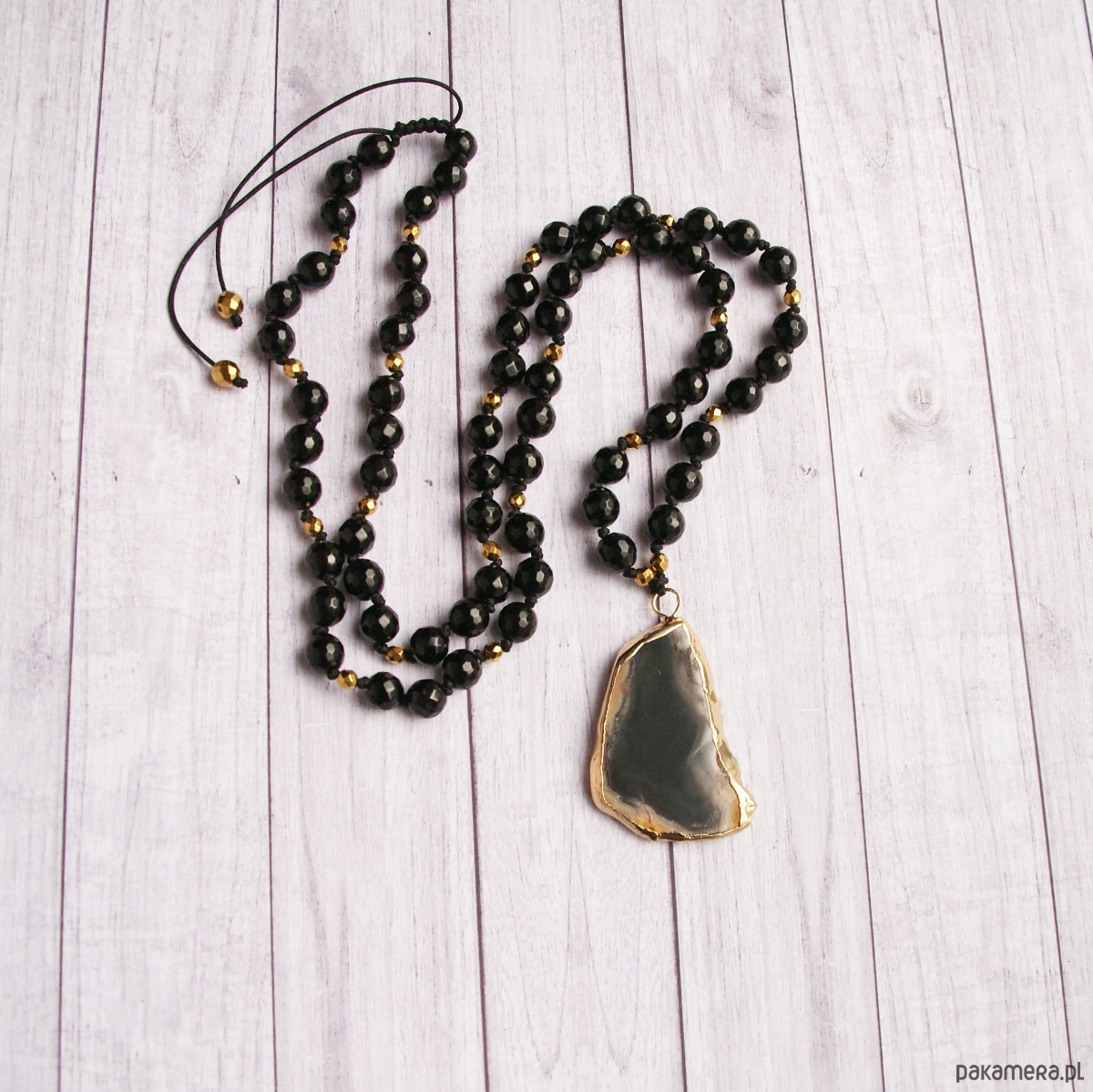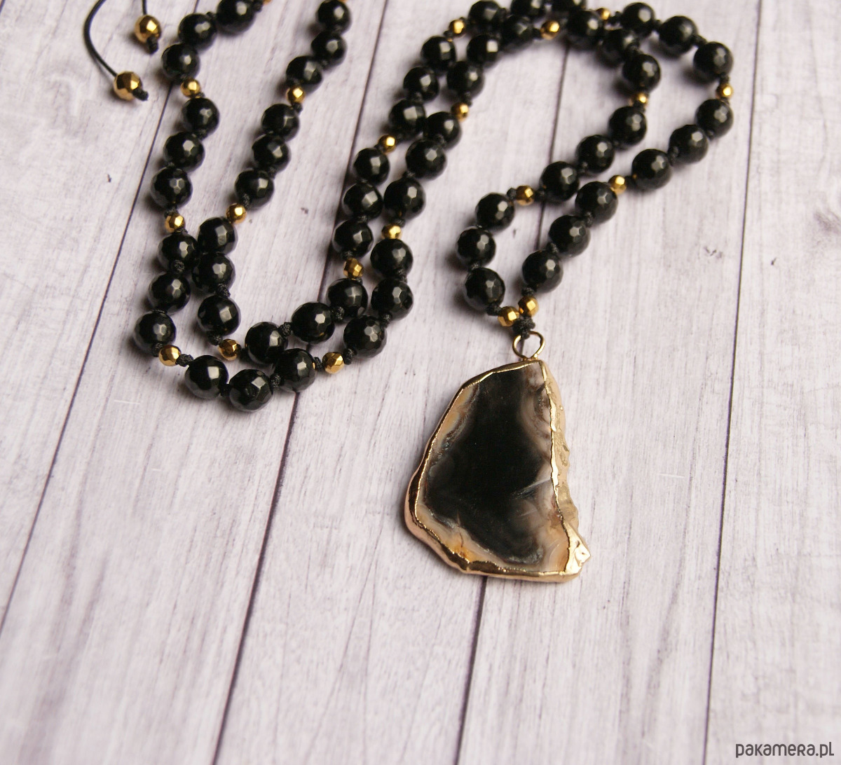niezwykle efektowny naszyjnik supełkowany, na solidnym sznurku nylonowym wykonany z kulek fasetowanego onyksu (8mm) oraz złotego hematytu 4mm. zawieszka to agat w złotej oprawie (5cm).