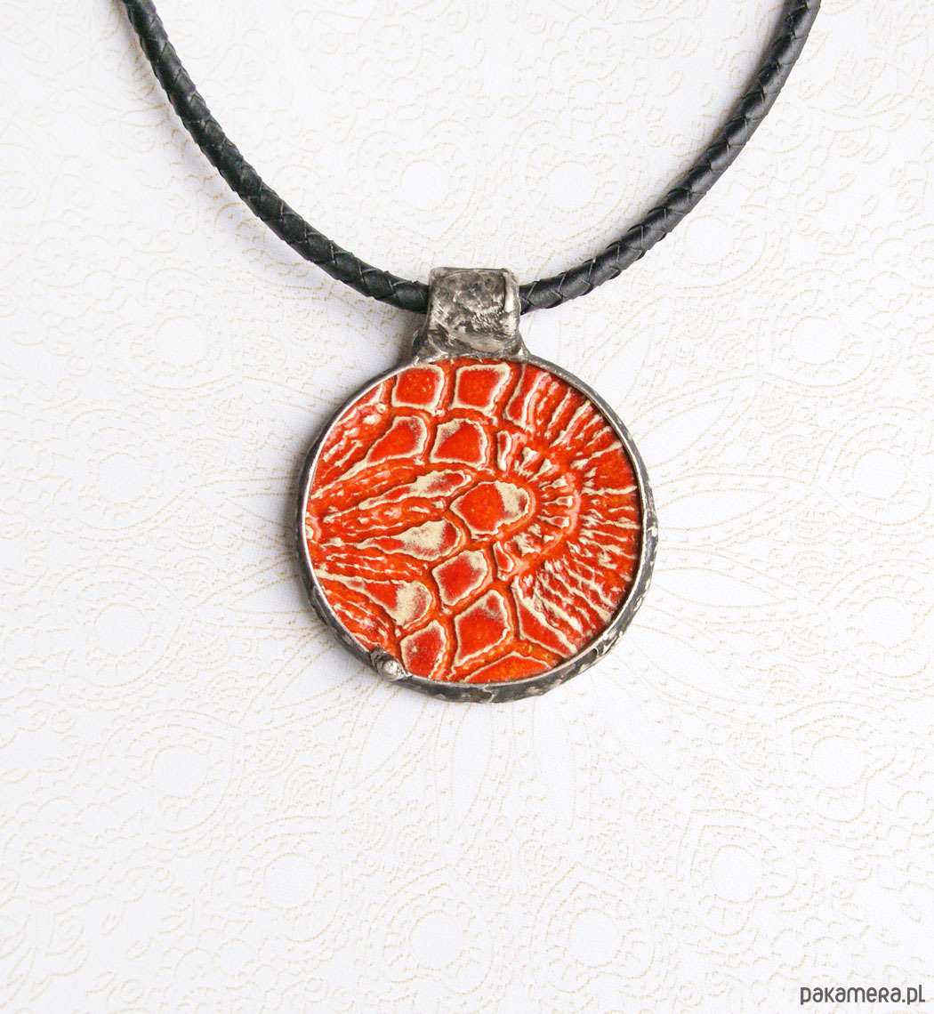 UNIKATOWY NASZYJNIK - wykonany z dużego, ceramicznego kaboszonu z wyraźną fakturą odciśniętej koronki. TUTAJ : POMARAŃCZOWY. kaboszony zostały wykonane specjalnie na kaktusiowe zamówienie przez POLSKĄ artystkę. ja oprawiłam je starannie w technice Tiffany w grubą, surową ramę wykonaną z miedzi pokrytej ekologiczną cyną (bez ołowiu). aby jeszcze bardziej podkreślić wyraźną fakturę na bokach, naszyjniki były patynowane (czernione) i przecierane. ... każdy naszyjnik to ABSOLUTNY UNIKAT = świetny pomysł na wyjątkowy prezent!!! jeden naszyjnik to efekt WIELOGODZINNEJ pracy... średnica koła: ok.60mm. wysokość zawieszki: ok.72mm. zawieszka na grubym plecionym rzemieniu ze skóry naturalnej w kolorze czarnym (5mm) o długości ok.43cm.
