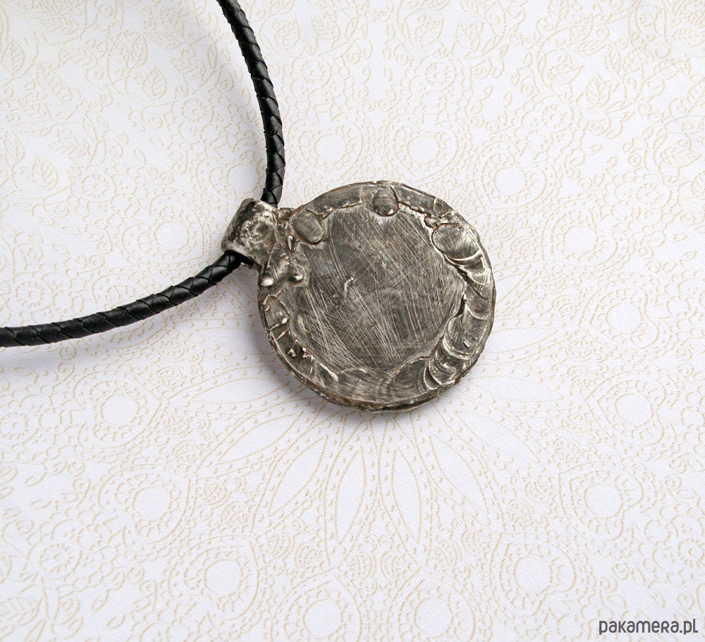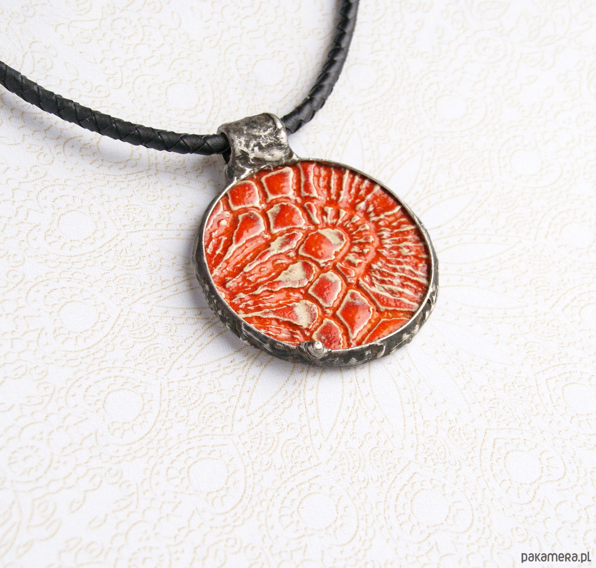 UNIKATOWY NASZYJNIK - wykonany z dużego, ceramicznego kaboszonu z wyraźną fakturą odciśniętej koronki. TUTAJ : POMARAŃCZOWY. kaboszony zostały wykonane specjalnie na kaktusiowe zamówienie przez POLSKĄ artystkę. ja oprawiłam je starannie w technice Tiffany w grubą, surową ramę wykonaną z miedzi pokrytej ekologiczną cyną (bez ołowiu). aby jeszcze bardziej podkreślić wyraźną fakturę na bokach, naszyjniki były patynowane (czernione) i przecierane. ... każdy naszyjnik to ABSOLUTNY UNIKAT = świetny pomysł na wyjątkowy prezent!!! jeden naszyjnik to efekt WIELOGODZINNEJ pracy... średnica koła: ok.60mm. wysokość zawieszki: ok.72mm. zawieszka na grubym plecionym rzemieniu ze skóry naturalnej w kolorze czarnym (5mm) o długości ok.43cm.