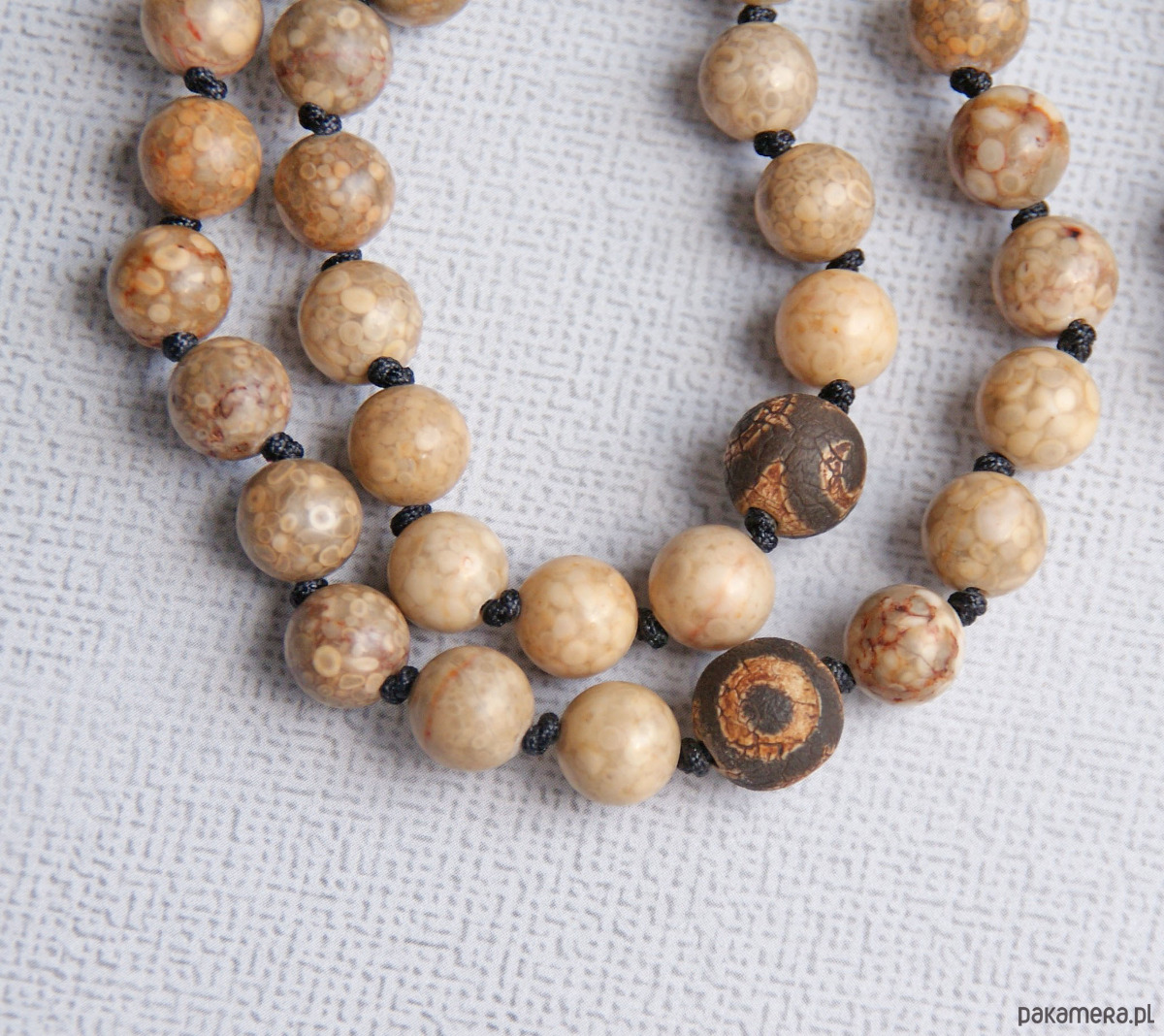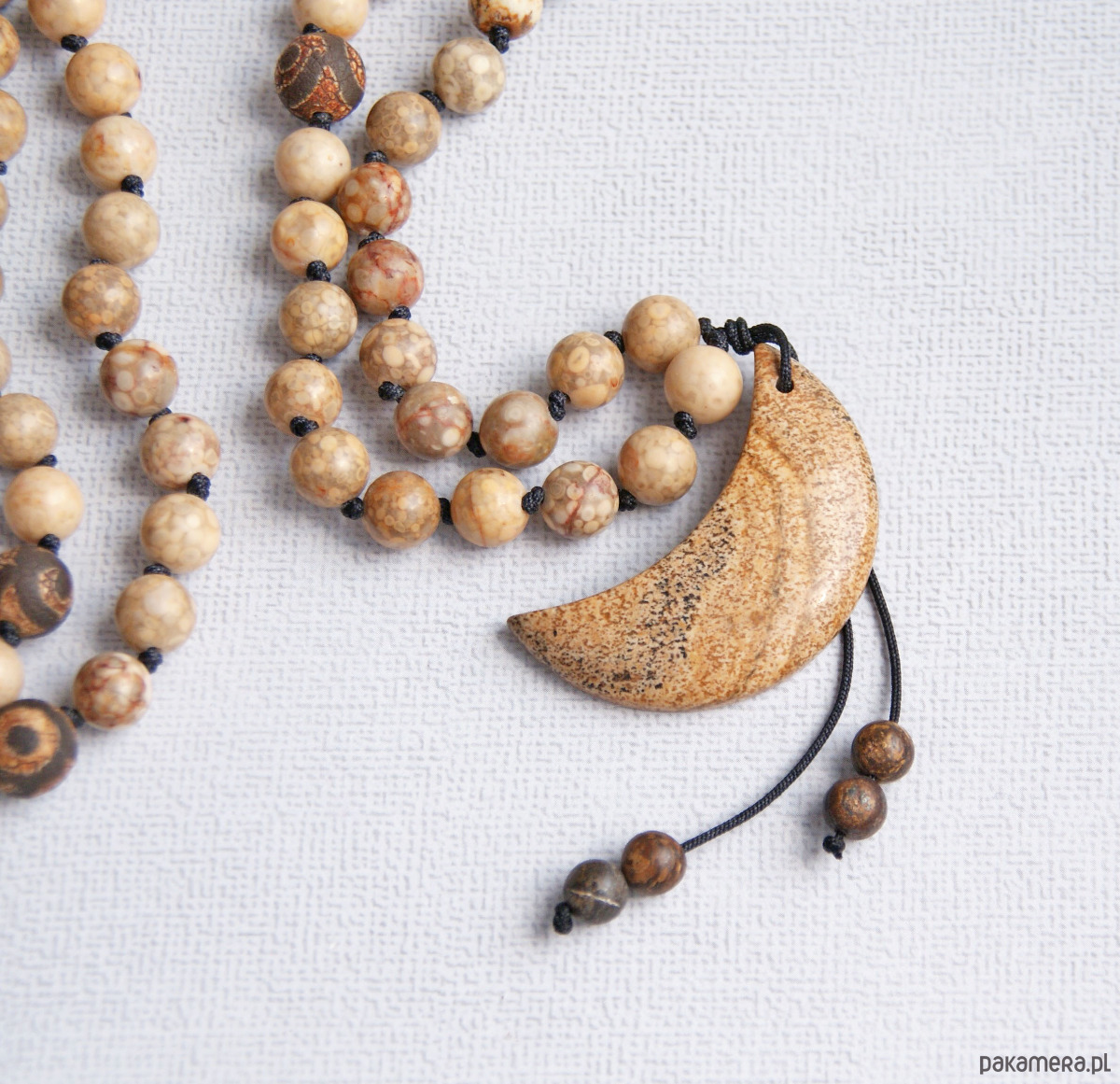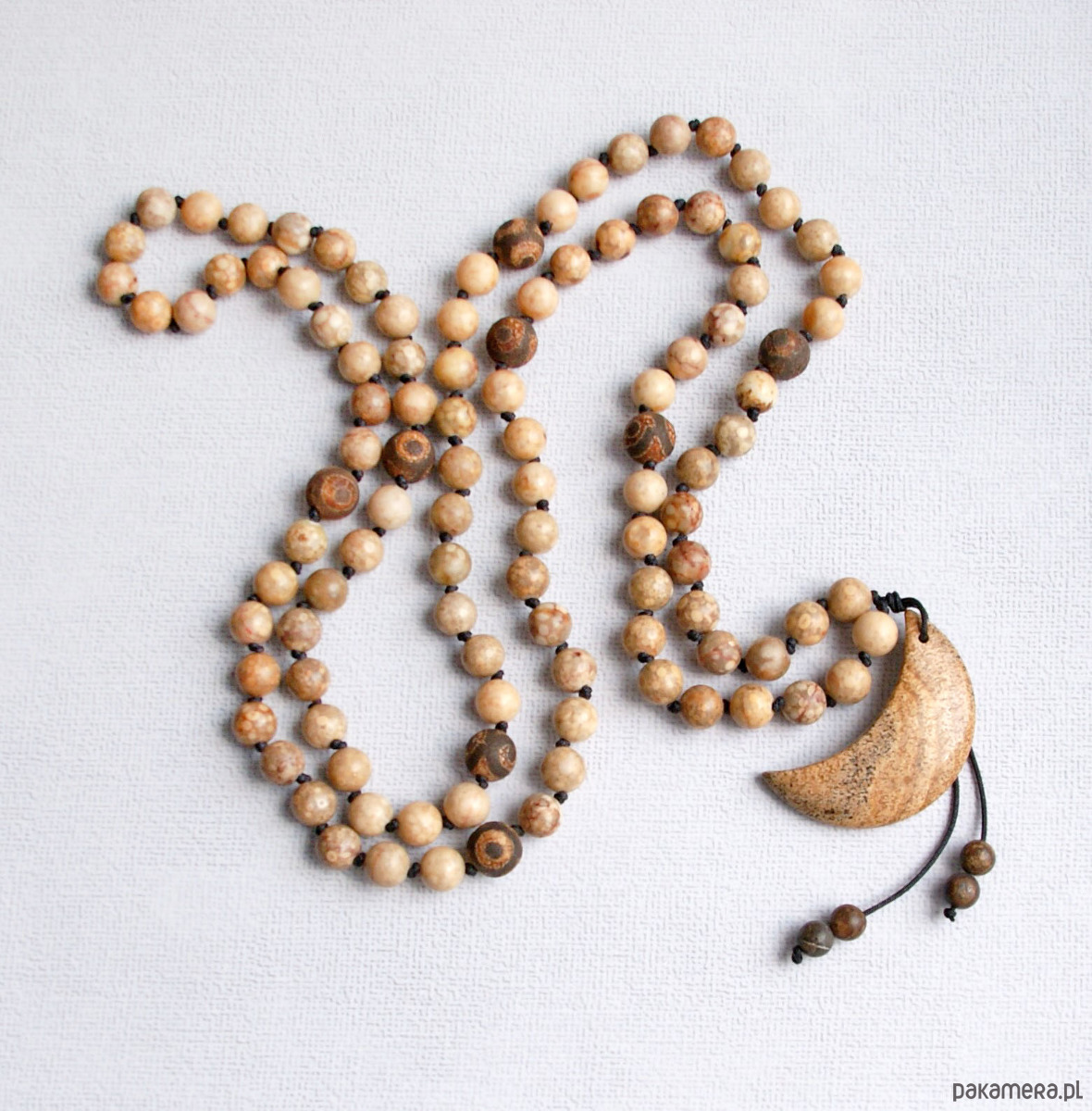 naszyjnik mala wykonany z tradycyjnej ilości 108 sztuk korali (jaspis oceaniczny 8mm + trawiony agat tybetański 11mm).