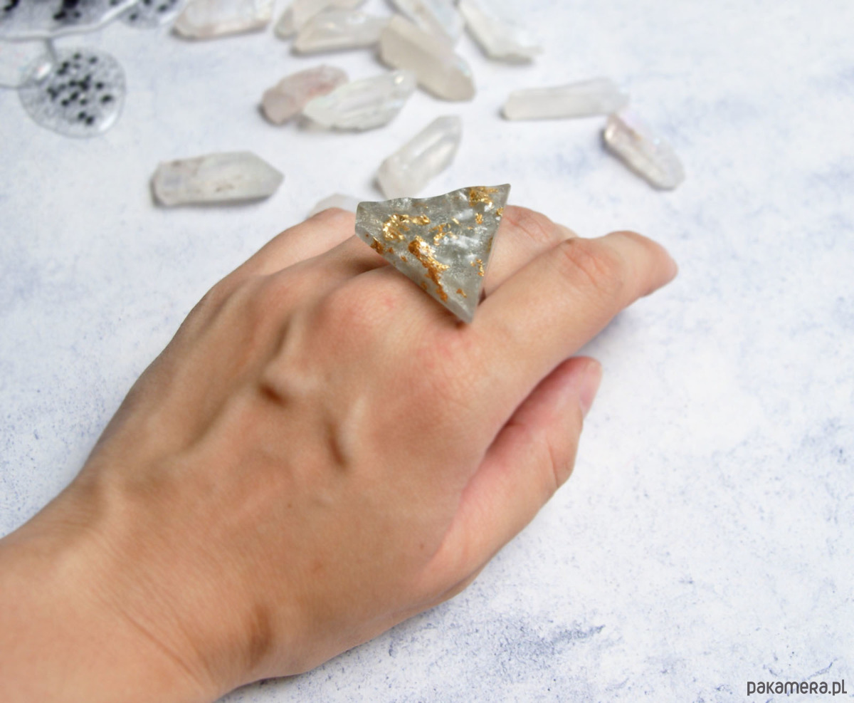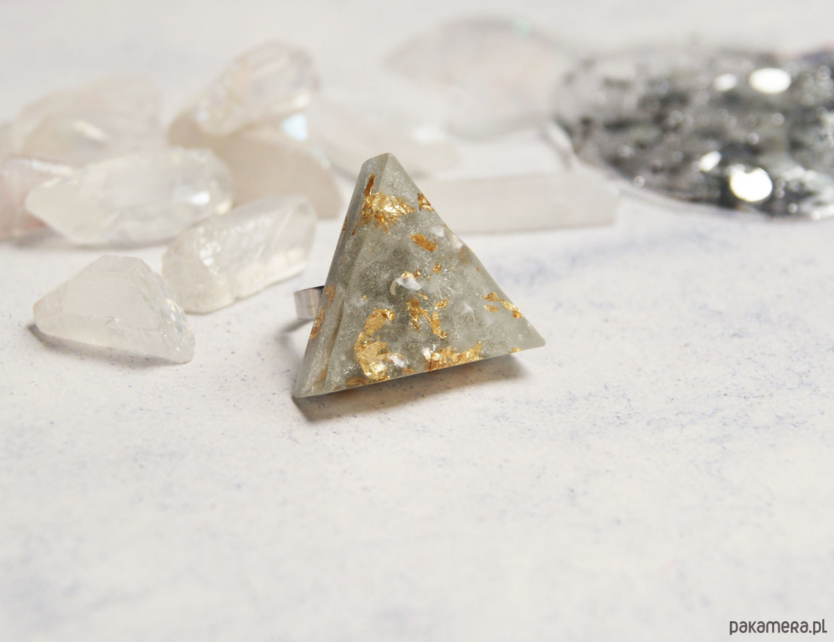 prosty, ale bardzo efektowny, spory pierścionek wykonany ze złotych płatków zatopionych w żywicy.
