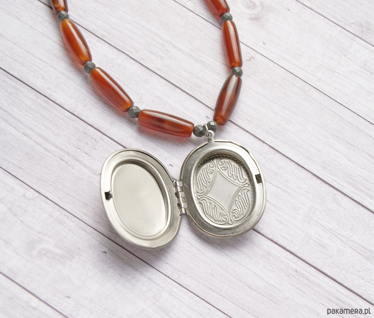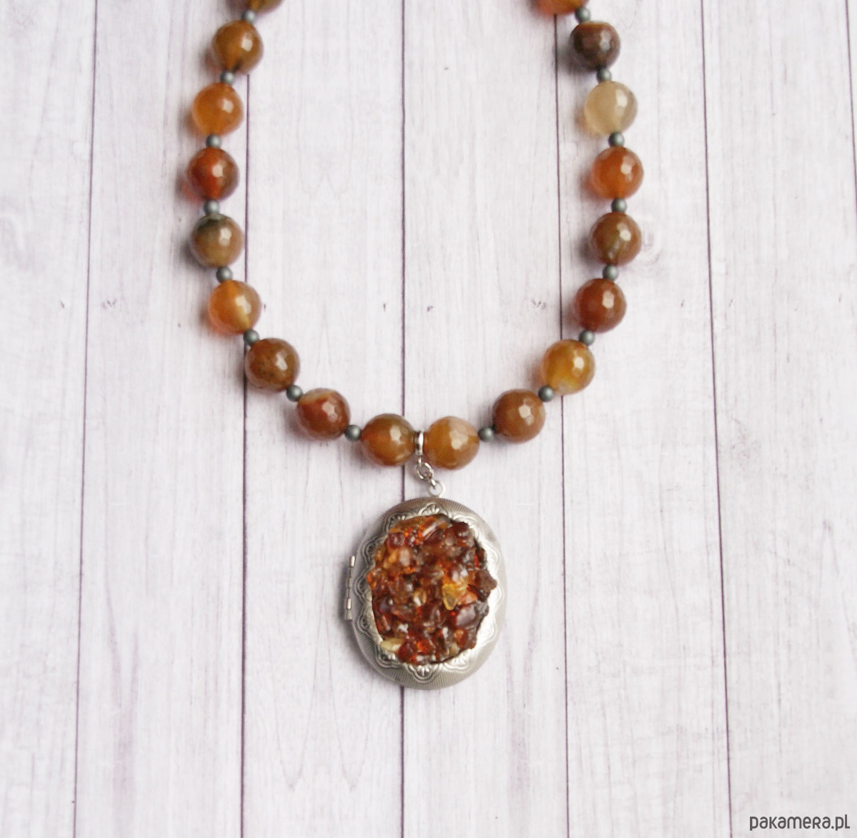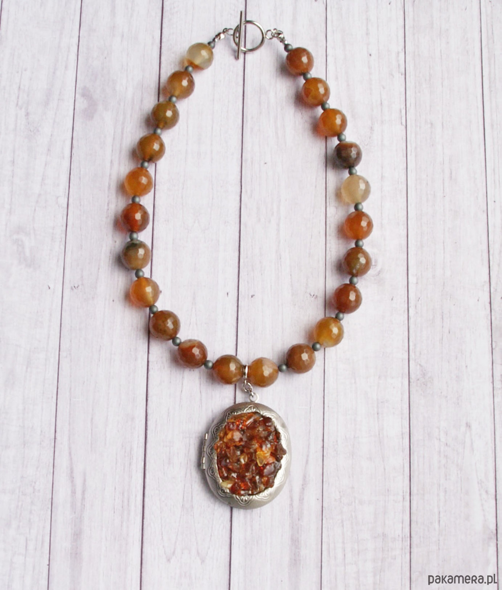 sekretnik zawiesiłam na sznurze agatu (DUŻE, fasetowane kule w odcieniach brązu 14mm) i hematytu matowego (kuleczki 4mm).
