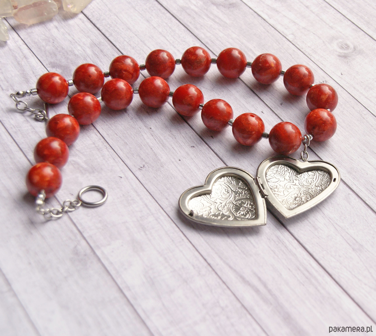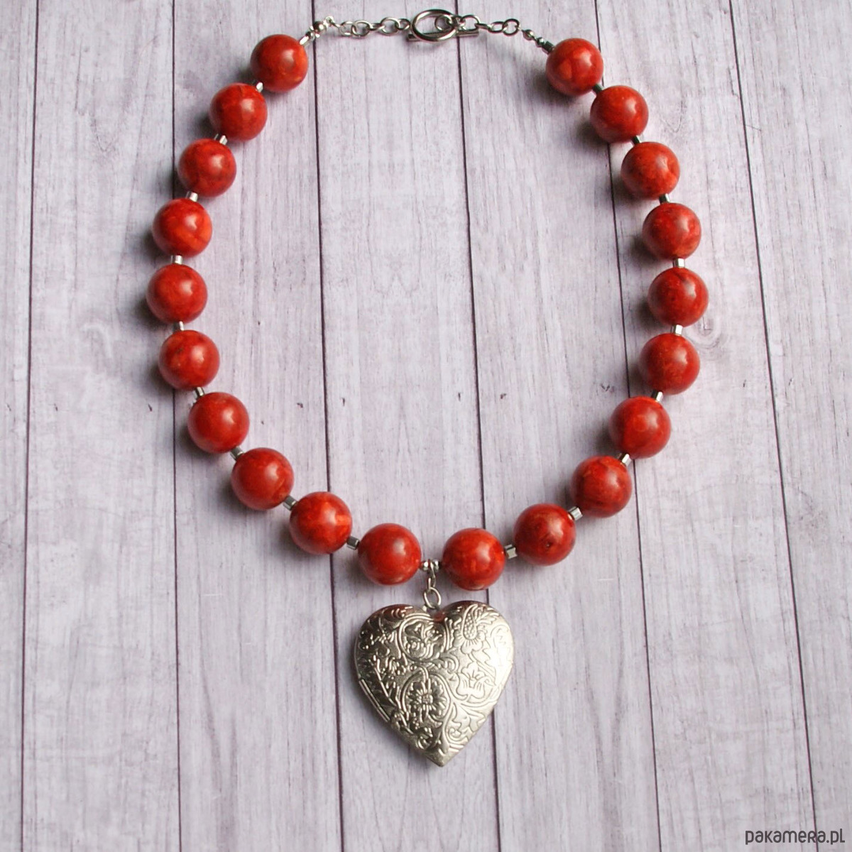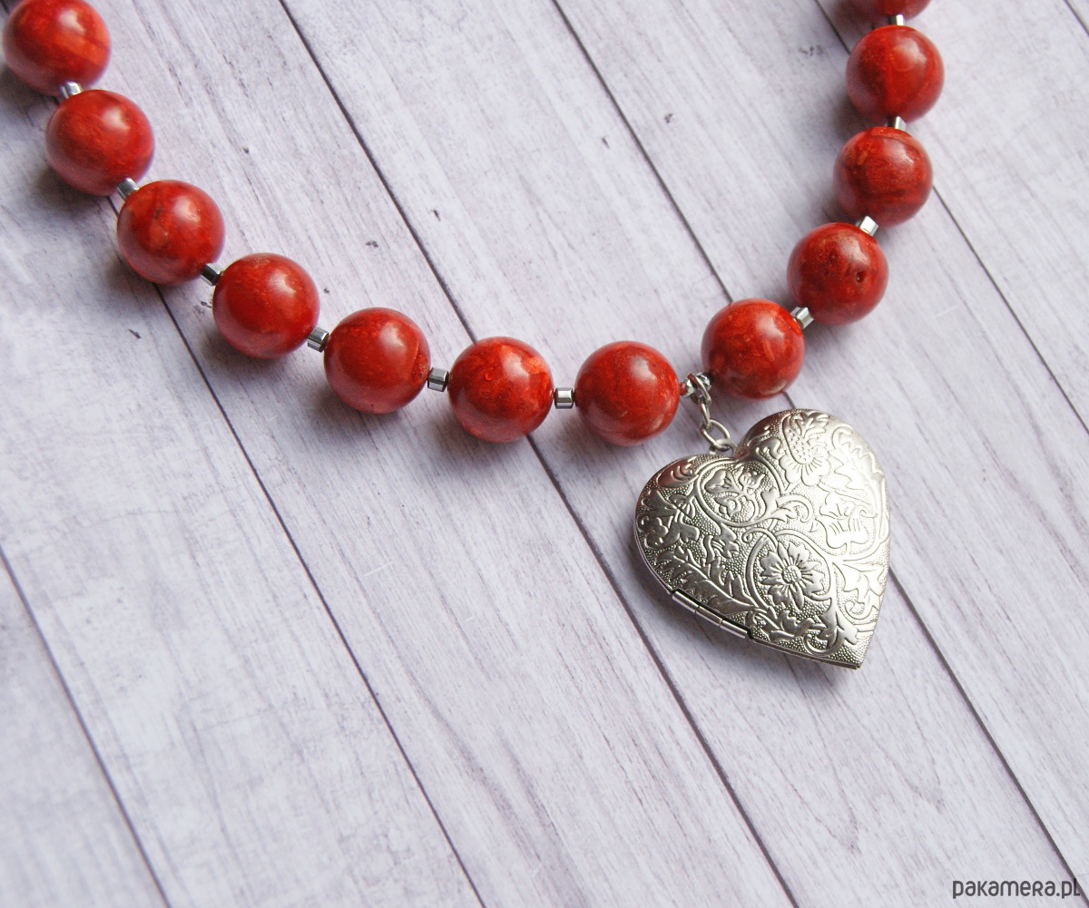sekretnik zawiesiłam na sznurze dużych kul korala rekonstruowanego (16mm) z przekładkami z hematytu (kosteczki 4mm).