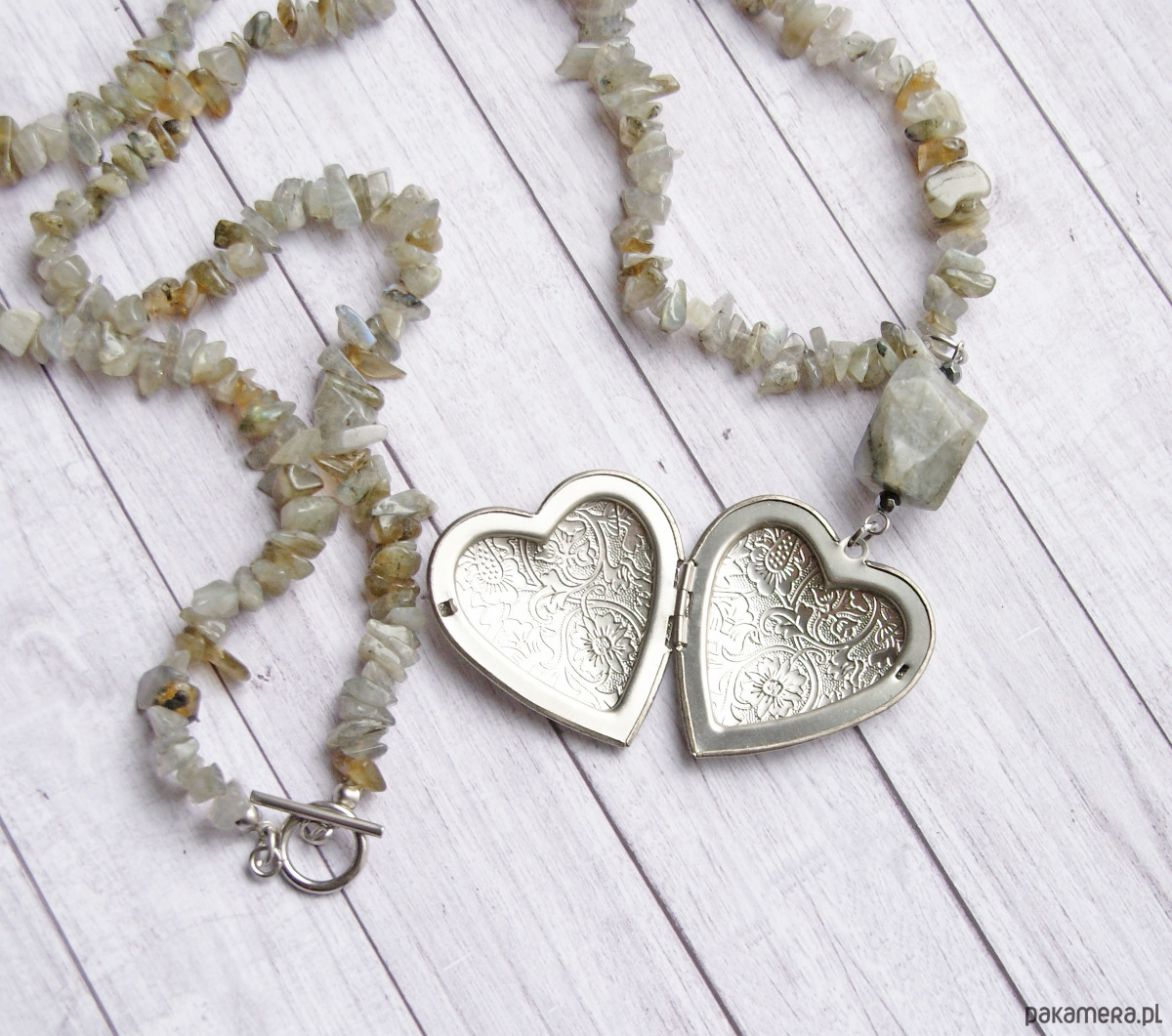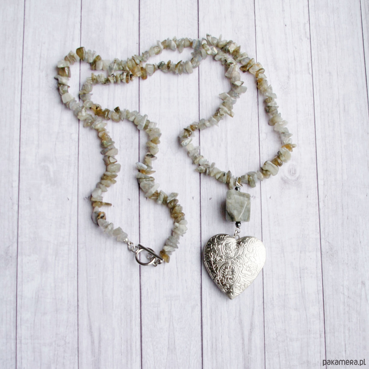 sekretnik, wraz z bryłką labradorytu (2cm), zawiesiłam na sznurze nieregularnej sieczki labradorytu.