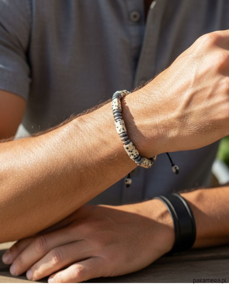 niezwykle okazała bransoleta męska NA SOLIDNYM SZNURECZKU NYLONOWYM wykonana z nieregularnych, polerowanych bryłek jaspisu dalmatyńskiego (ok. 8x12-15mm), przekładek z matowego hematytu grafitowego.