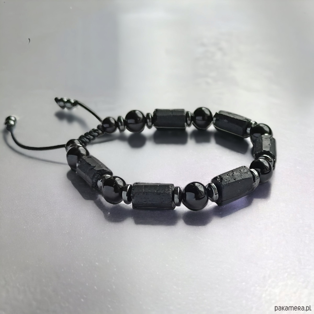 niezwykle okazała bransoleta męska NA SOLIDNYM SZNURECZKU NYLONOWYM wykonana z nieregularnych bryłek surowego czarnego turmalinu (ok. 8x12-15mm), kul onyksu 8mm (błysk), przekładek z hematytu grafitowego.