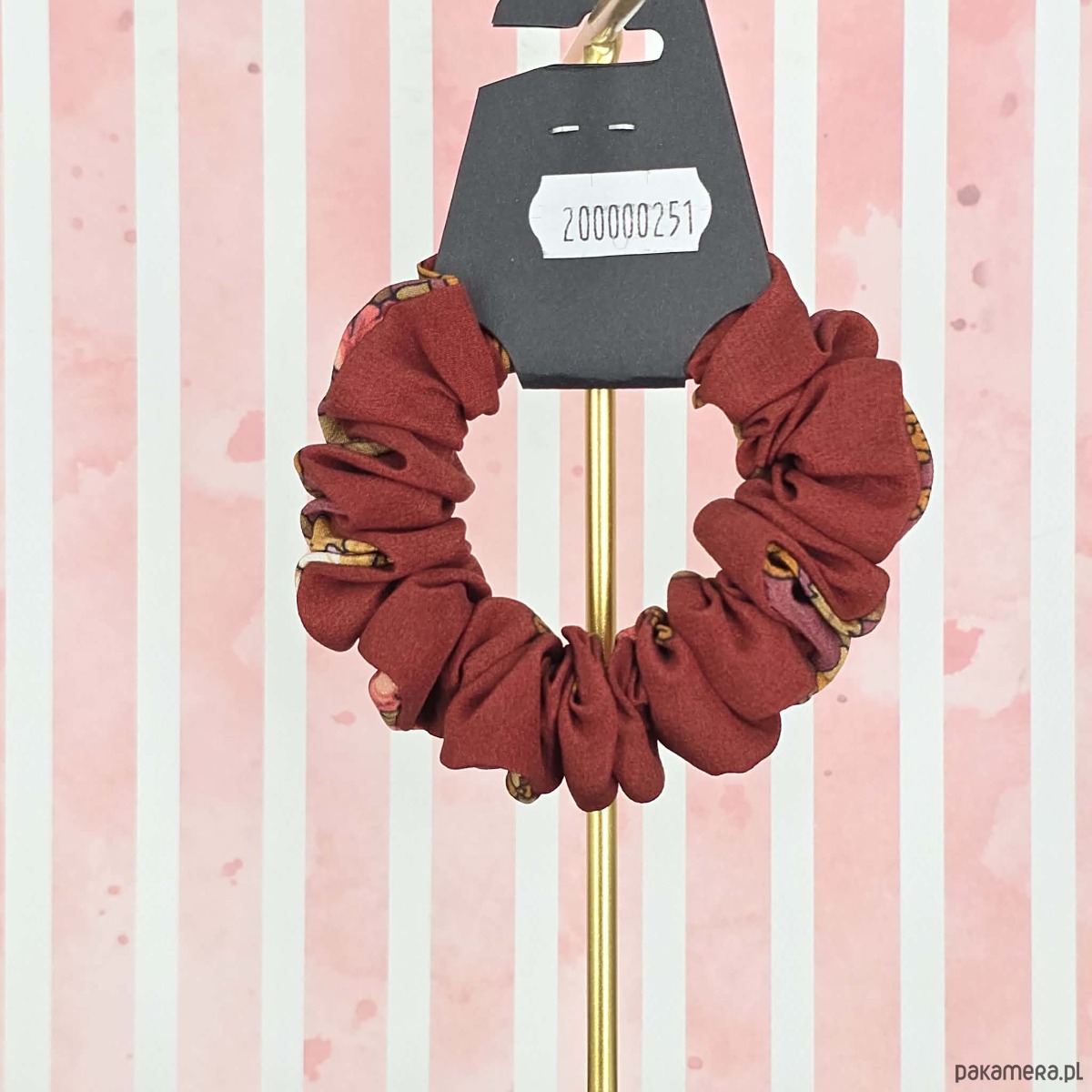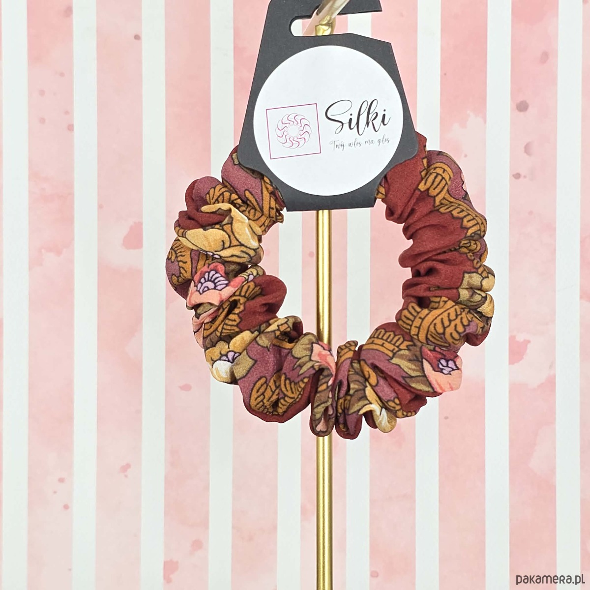S wąska gumka jedwabna do włosów jedwab naturalny scrunchie brązowa w kwiaty