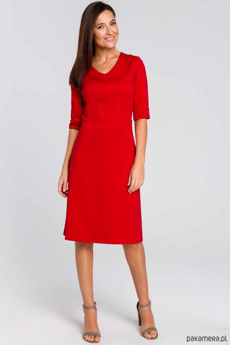 Skromna w kroju i wykończeniach sukienka na każdą okazję. Fason litery A z dekoltem i rękawami przed łokcie.