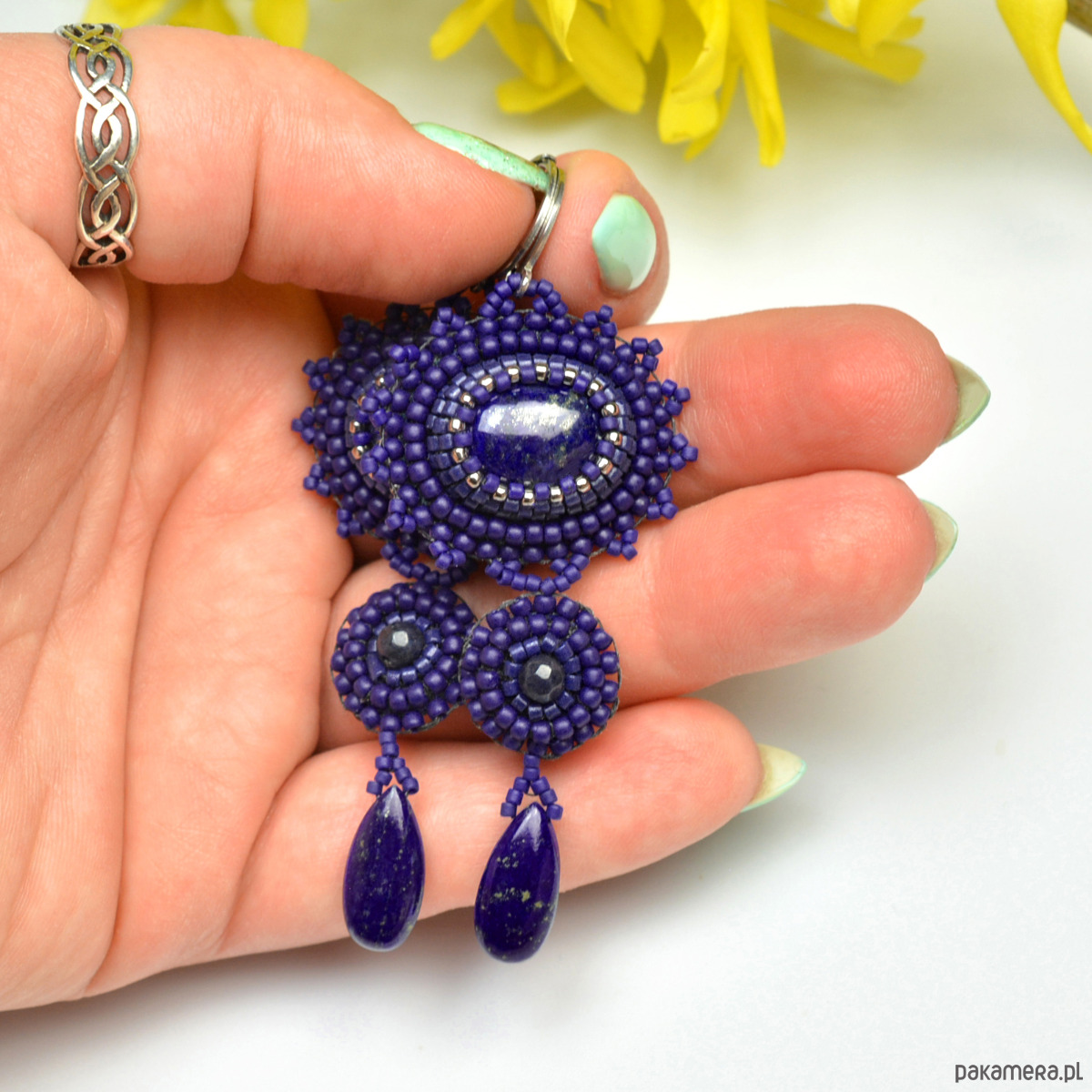 Ich sercem jest lapis lazuli - kaboszony i łezki, oraz fasetowane kulki barwionego jadeitu. Oplotłam je najwyższej jakości japońskimi koralikami Toho i Miyuki w kolorze kobaltowym złamanym odrobiną metalicznego srebra.
