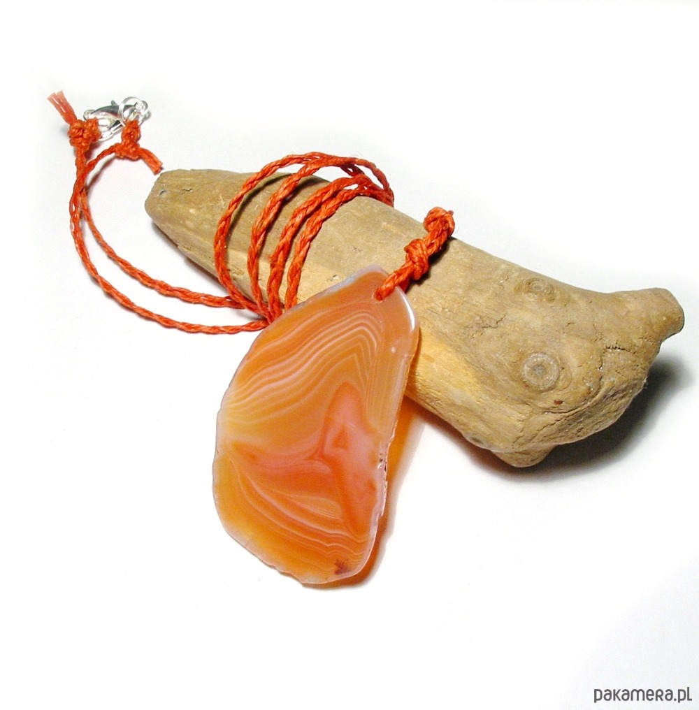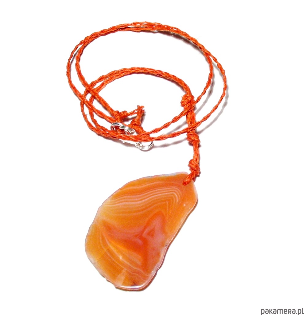 Autorski wisior z pięknego agatu oprawiony na oranżowej przędzy lnianej.