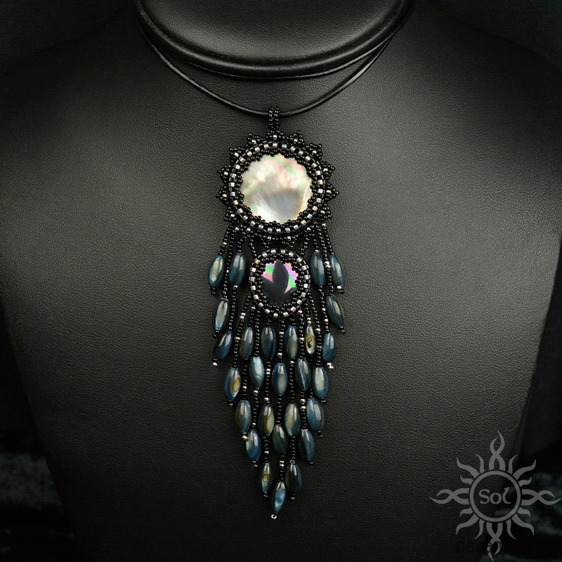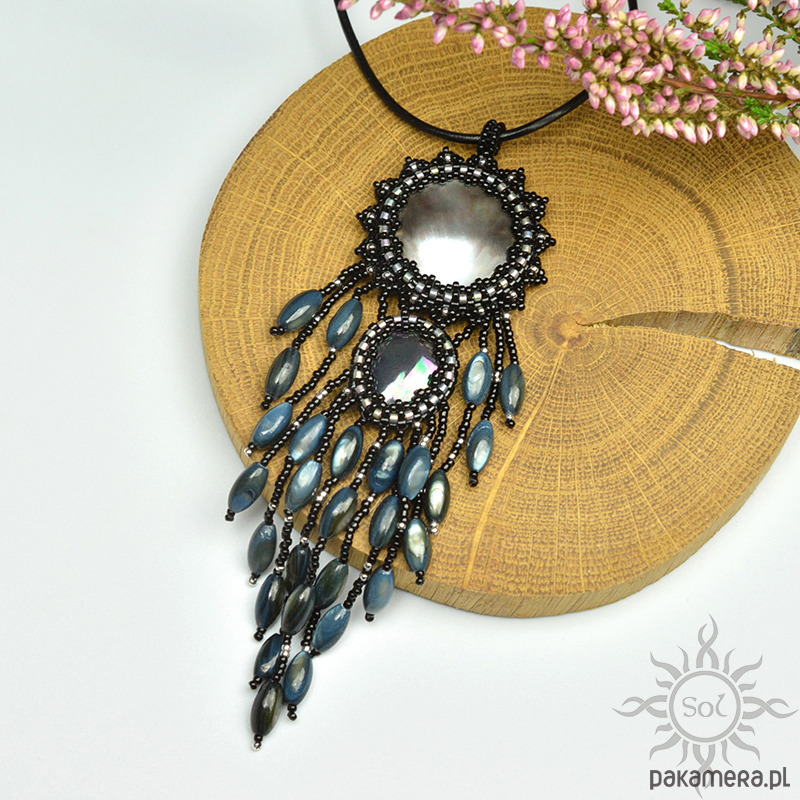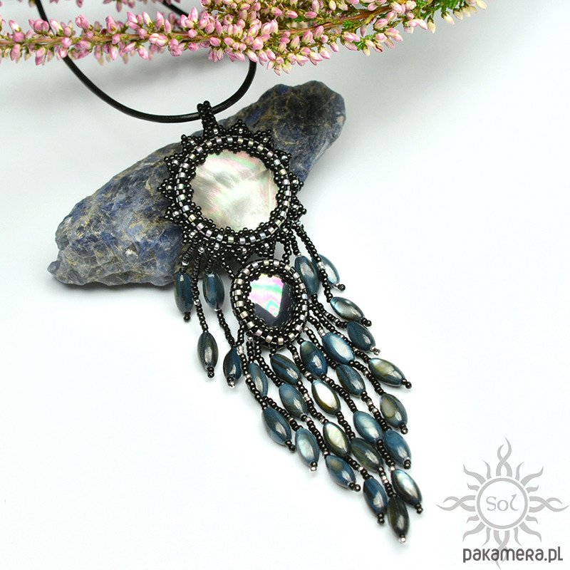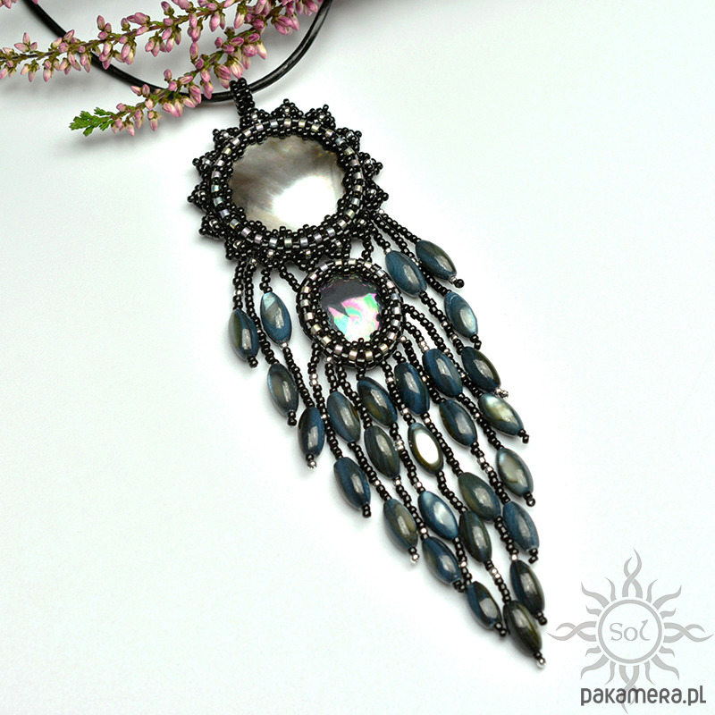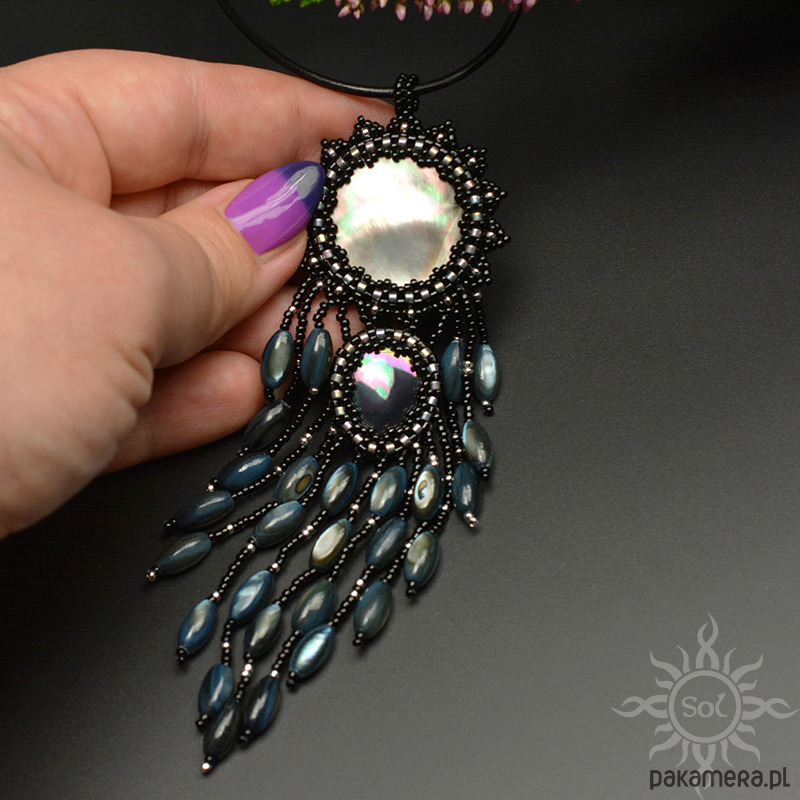 Jego sercem jest moneta opalizującej masy perłowej i łezka perły seashell. Oplotłam je najwyższej jakości japońskimi koralikami Toho i Miyuki w kolorze czarnym złamanym odrobiną jasnego srebra (część również z efektem tęczowej opalizacji).