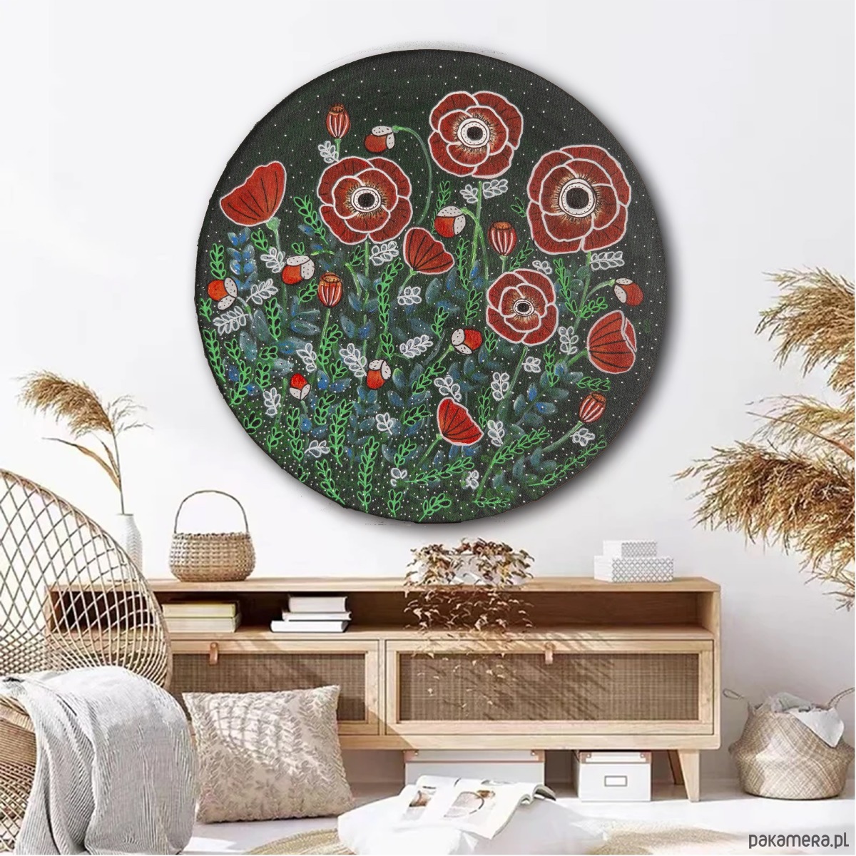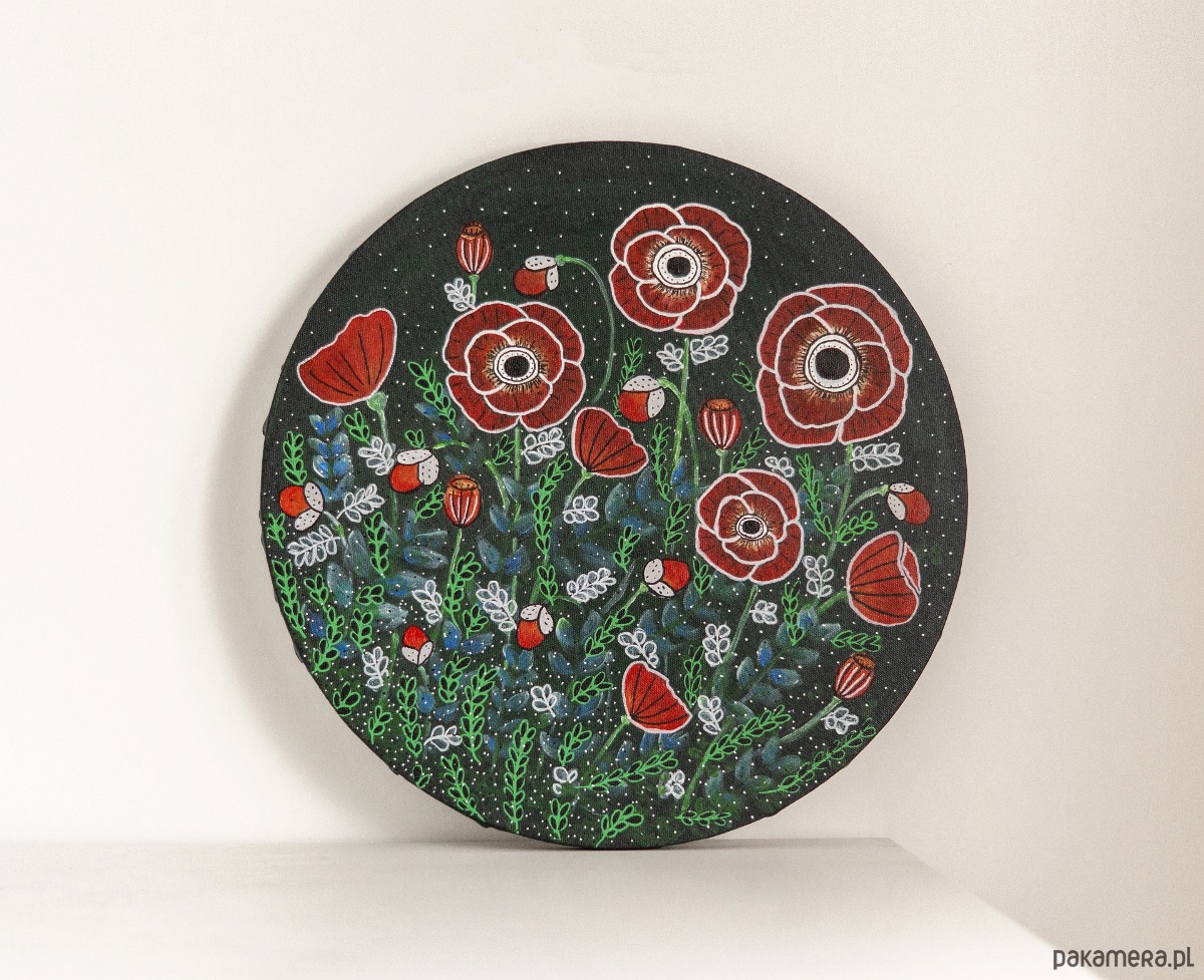 Sale! Akryl na okrągłym płótnie. Maki na łące
