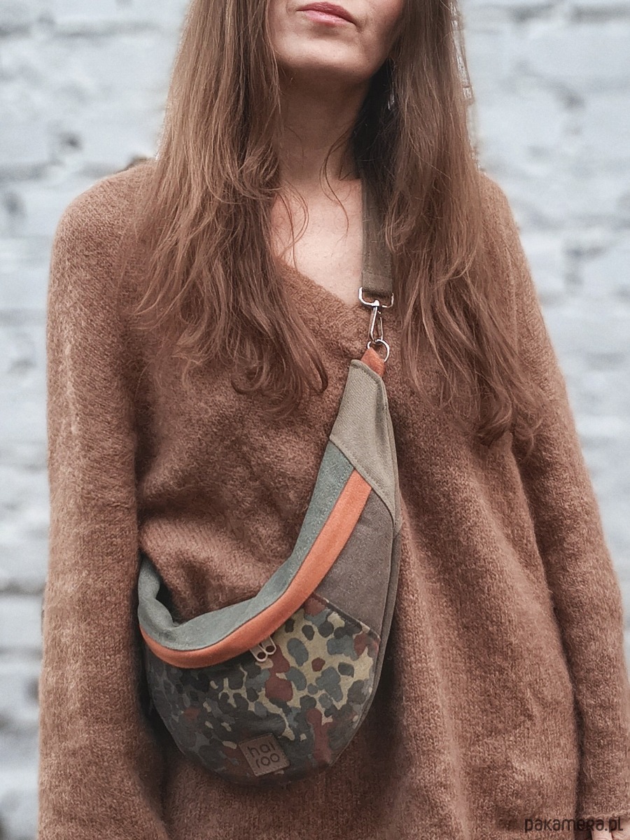 Została wykonana z tkanin canvas brązowych, zielonych i moro w duchu no waste.
