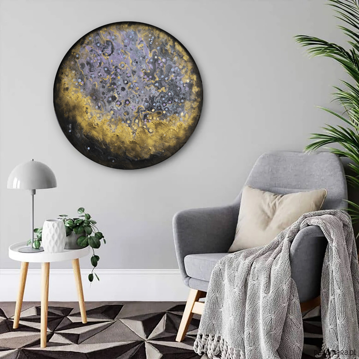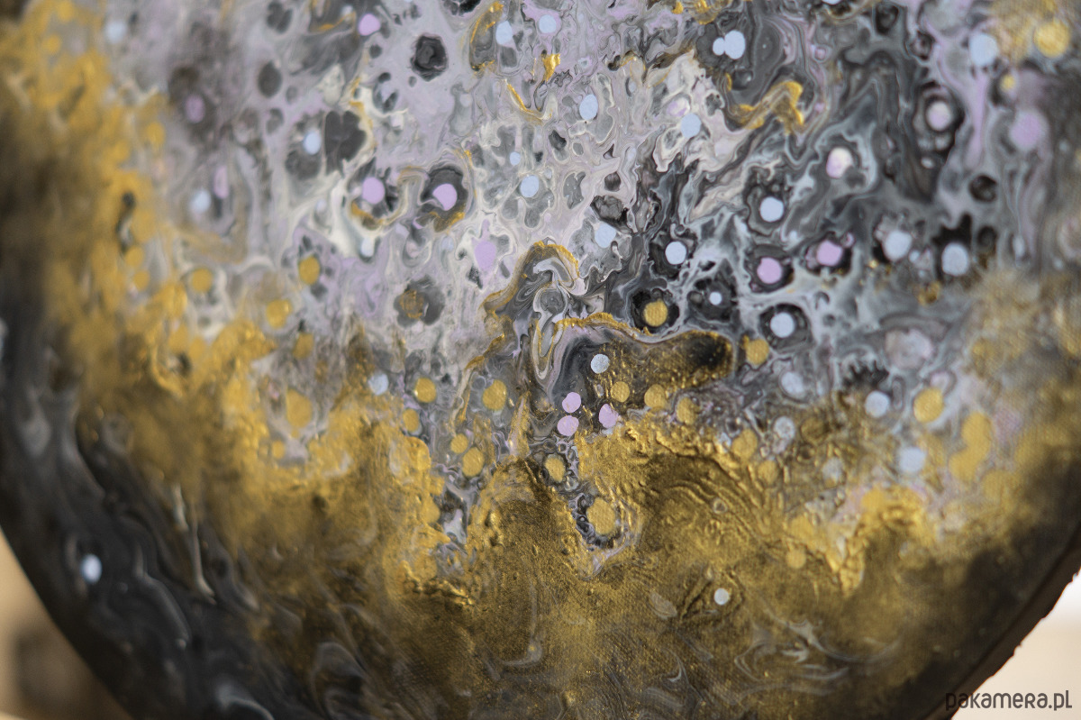 Obraz mojego autorstwa ze złotą farbą, malowany farbami akrylowymi na podobraziu malarskim o średnicy 40cm.