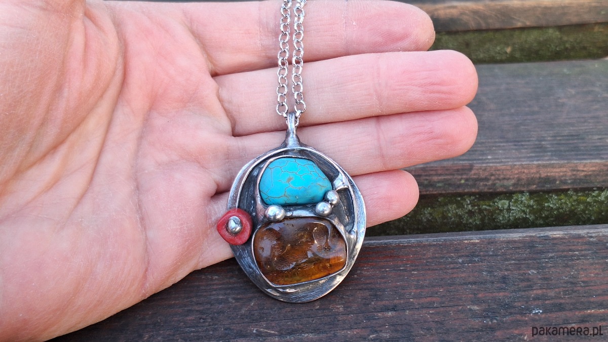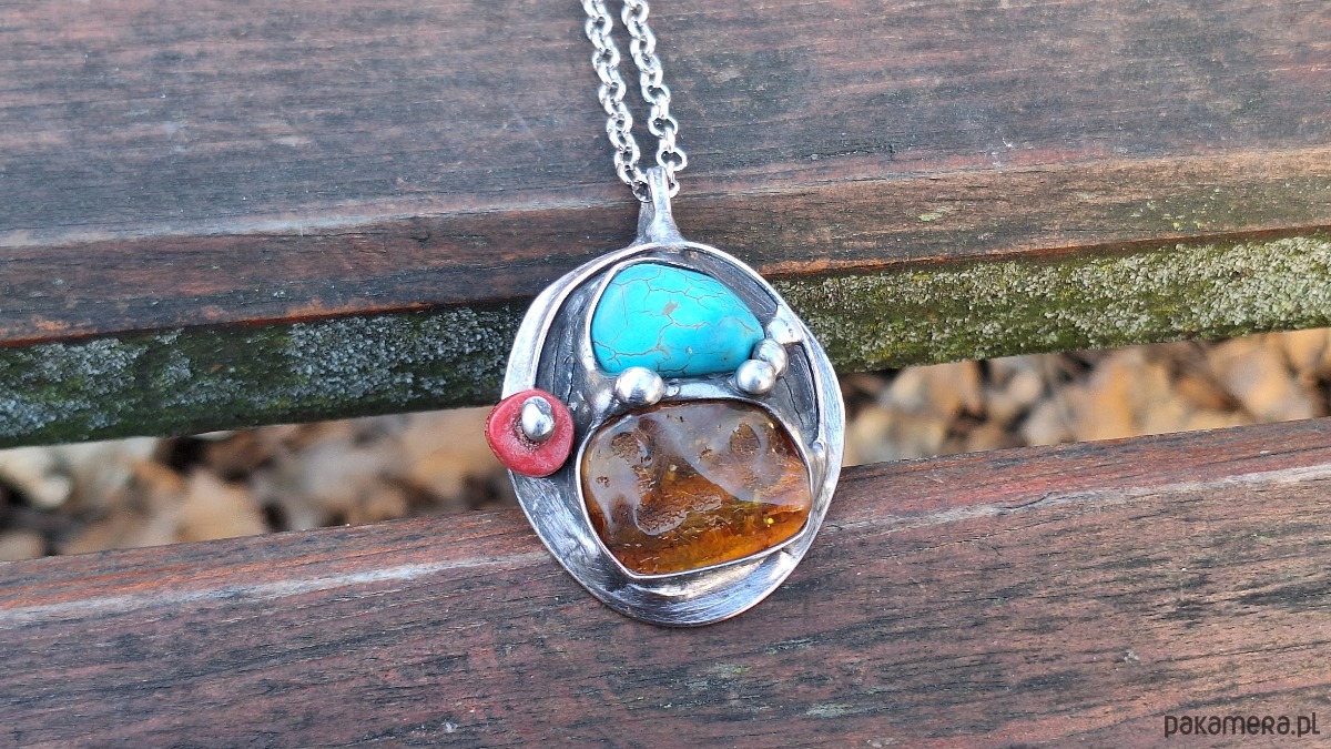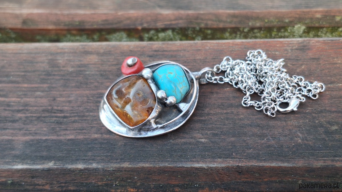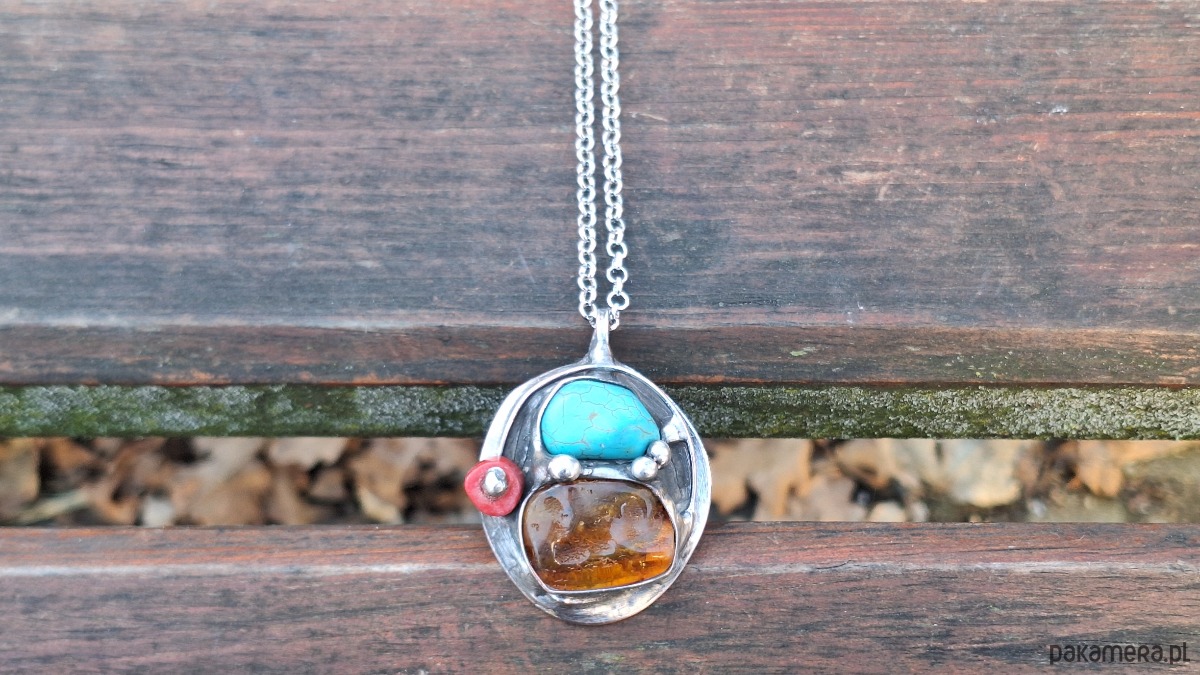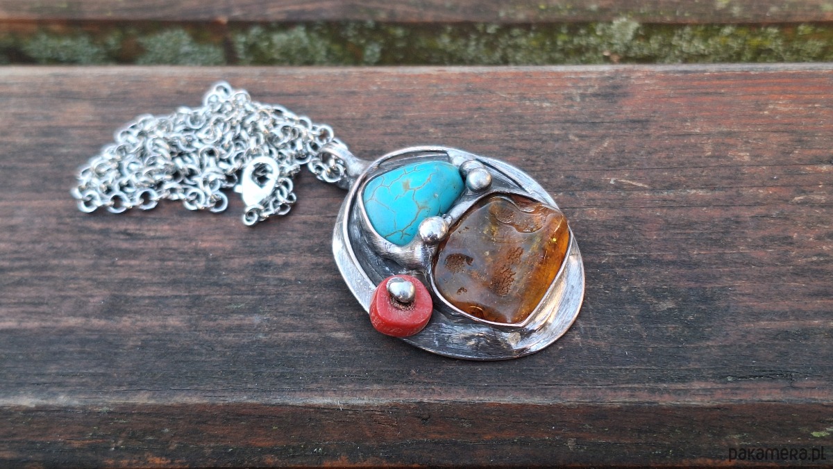 Wisiorek wykonany z miedzi, cyny, howlitu, koralowca i bursztynu. Wymiary ok. 4 na 3.5 cm. Zawieszony na łańcuszku o długości ok. 50 cm.