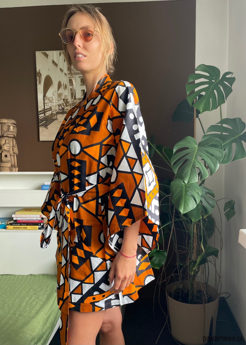 Samakaka Brown z kolekcji Angola rozsiewa pozytywne wibracje po świecie i do Waszych codziennych stylizacji. Nosząc je będziecie się czuli wygodnie, a jednocześnie wyglądali zjawiskowo. Bawełna, jako naturalna tkanina pozwala oddychać skórze i jest przyjazna dla środowiska. Soczyste kolory wzmacniają Waszą wewnętrzną siłę i wprawiają w doskonały nastrój. Klasyczny krój kimona i jego szerokie autorskie rękawy pasują zarówno mężczyznom, jak i kobietom. Dołączony pasek można zawiązać w talii, podkreślając w ten sposób sylwetkę lub zawiązać go na głowie, jako opaskę.