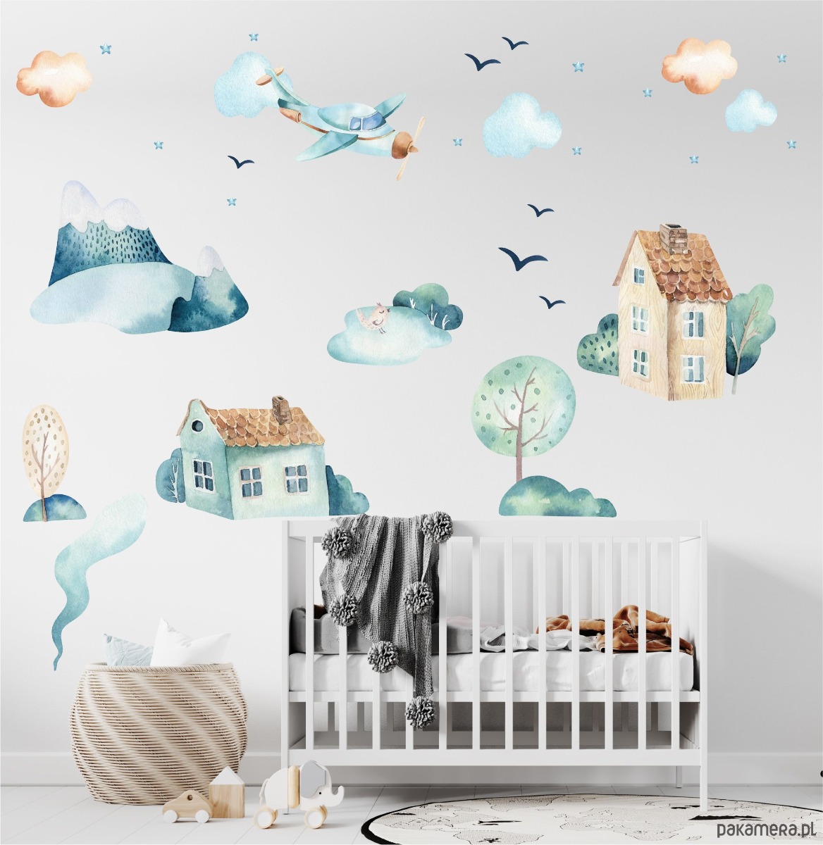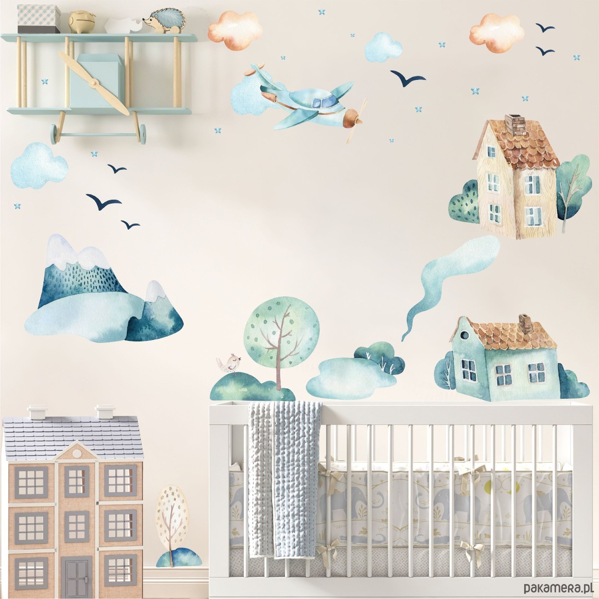 Dekoracja ścienna z samolotem i miasteczkiem, tworząca ilustracyjną scenkę do pokoju dziecka.