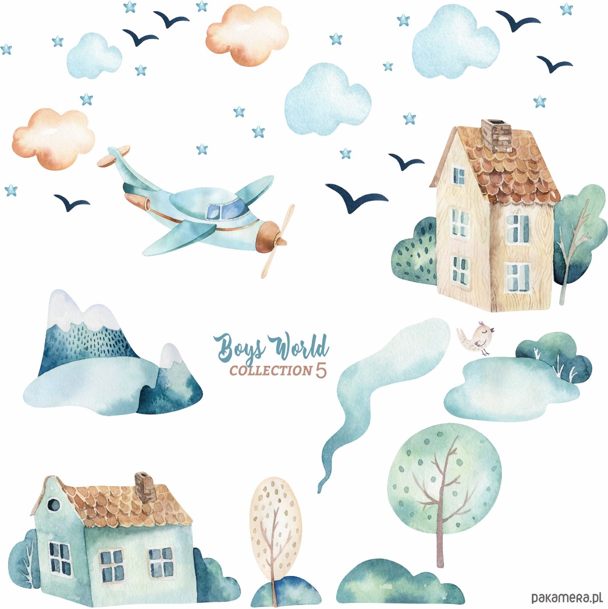 M - samolot 30×20, domy 33×30, 35×20, góry 27×19, rzeczka 15×30, drzewa 11×20, 17×22, krzaczek 22×18, trawa 19×7, chmurki 8–13cm(szer.)×5szt, gwiazdki ok. 2cm×16szt, ptaszki 5–9,5cm×7szt, ptaszek ok. 6cm