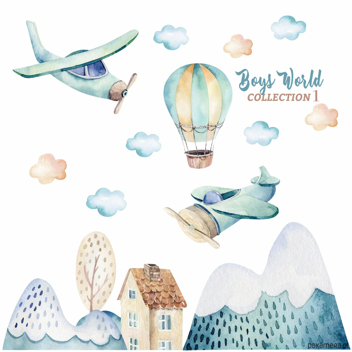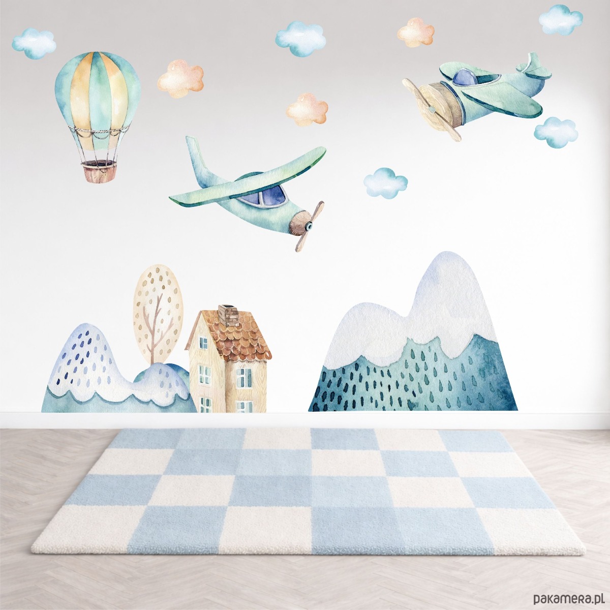 Dekoracja ścienna z samolotami, balonem i miasteczkiem, tworząca ilustracyjną scenkę do pokoju dziecka. Akwarelowe motywy dobrze wpisują się w jasne, dziecięce wnętrza.