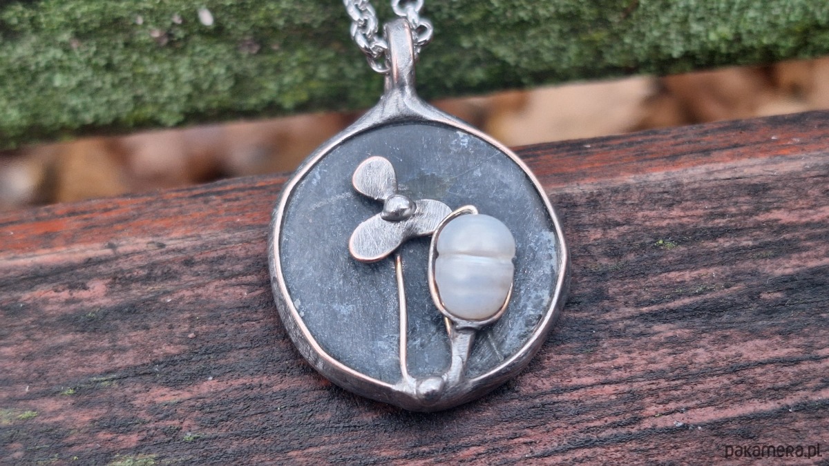 Wisiorek wykonany z miedzi, cyny, perły i agatu. Wymiary ok. 2.5 na 2.5 cm. Zawieszony na łańcuszku o długości ok. 50 cm.
