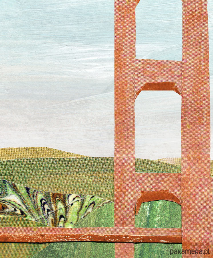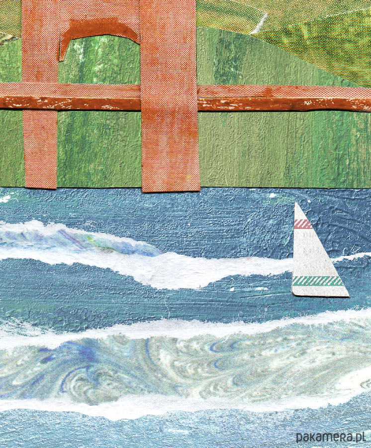 Plakat podróżniczy w stylu vintage przedstawiający widok na słynny most Golden Gate w zatoce San Francisco. Grafika w formie kolażu bawiąca się barwami i teksturami. Na pierwszym planie dwie żaglówki zmagają się z wzburzonymi falami.