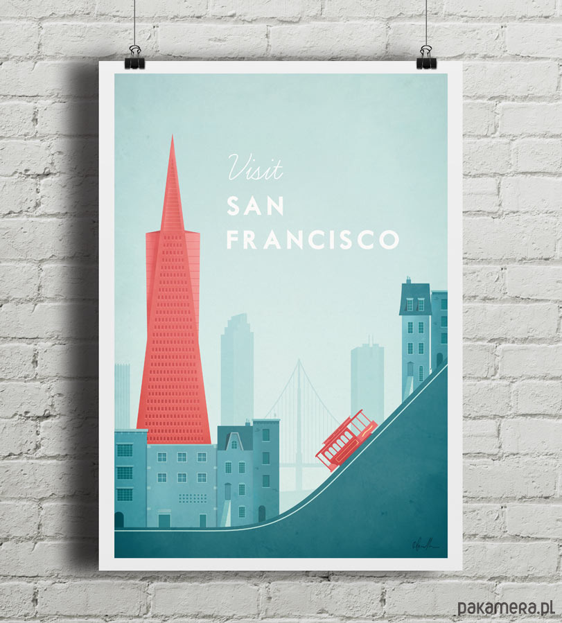 Plakat w stylu vintage przedstawiający panoramę San Francisco z charakterystycznym wieżowcem Transamerica Pyramid i tramwajem na pierwszym planie. Inspirowany plakatami podróżniczymi z lat 20-tych XX wieku.