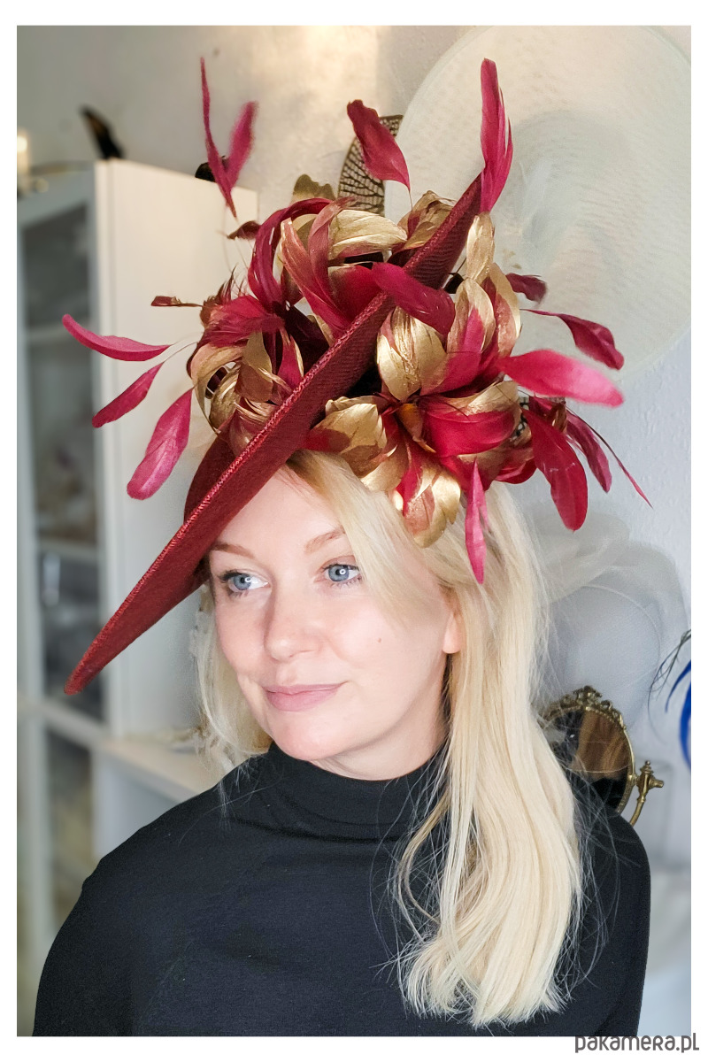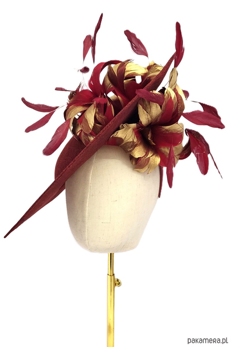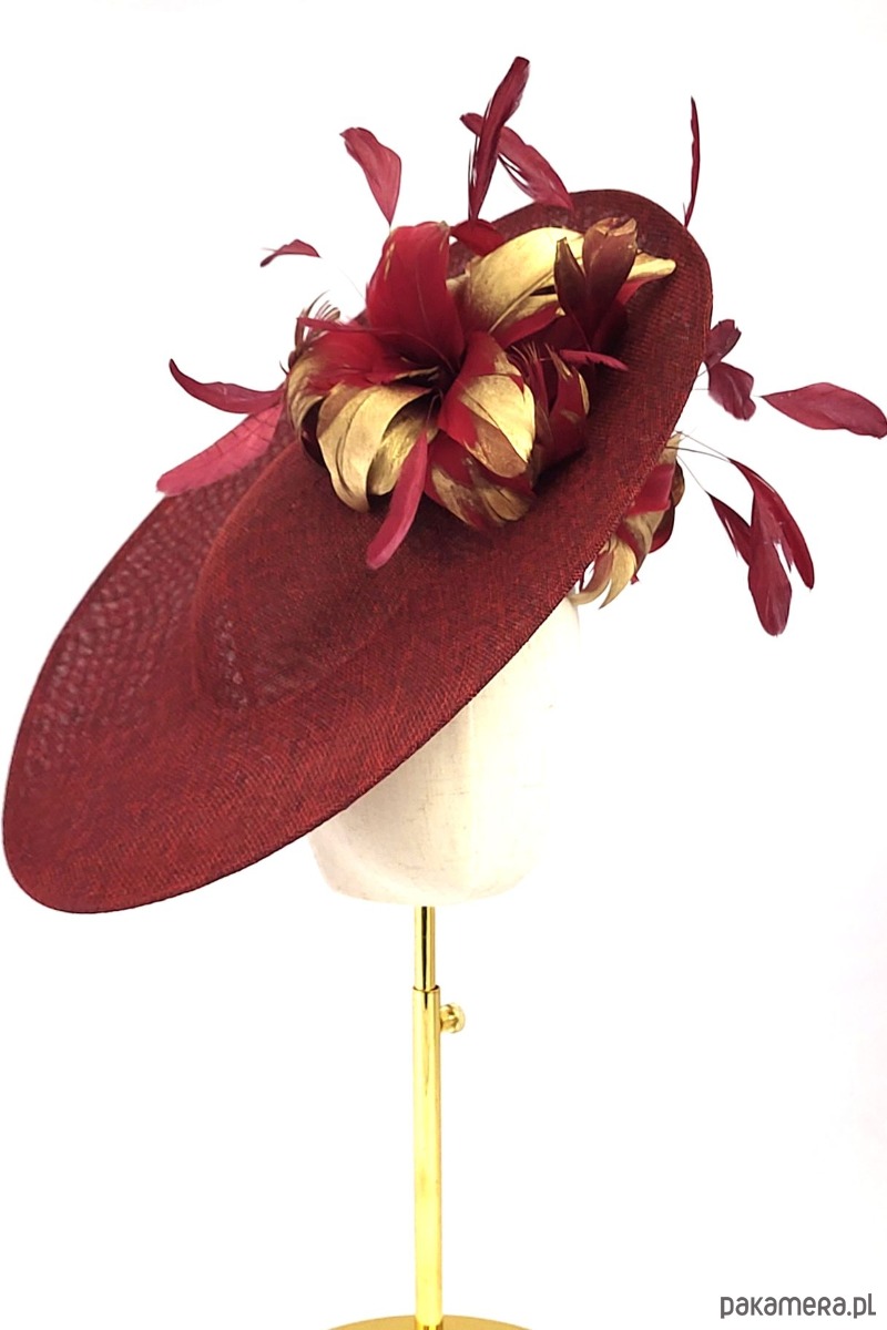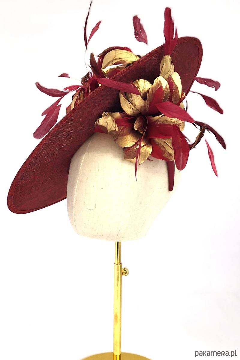 Spektakularna forma: Dynamicznie wyprofilowane rondo w głębokim odcieniu bordo stanowi idealną bazę dla kaskady dekoracyjnych piór. Hattinator średnica 40cm, noś na prawą stronę.