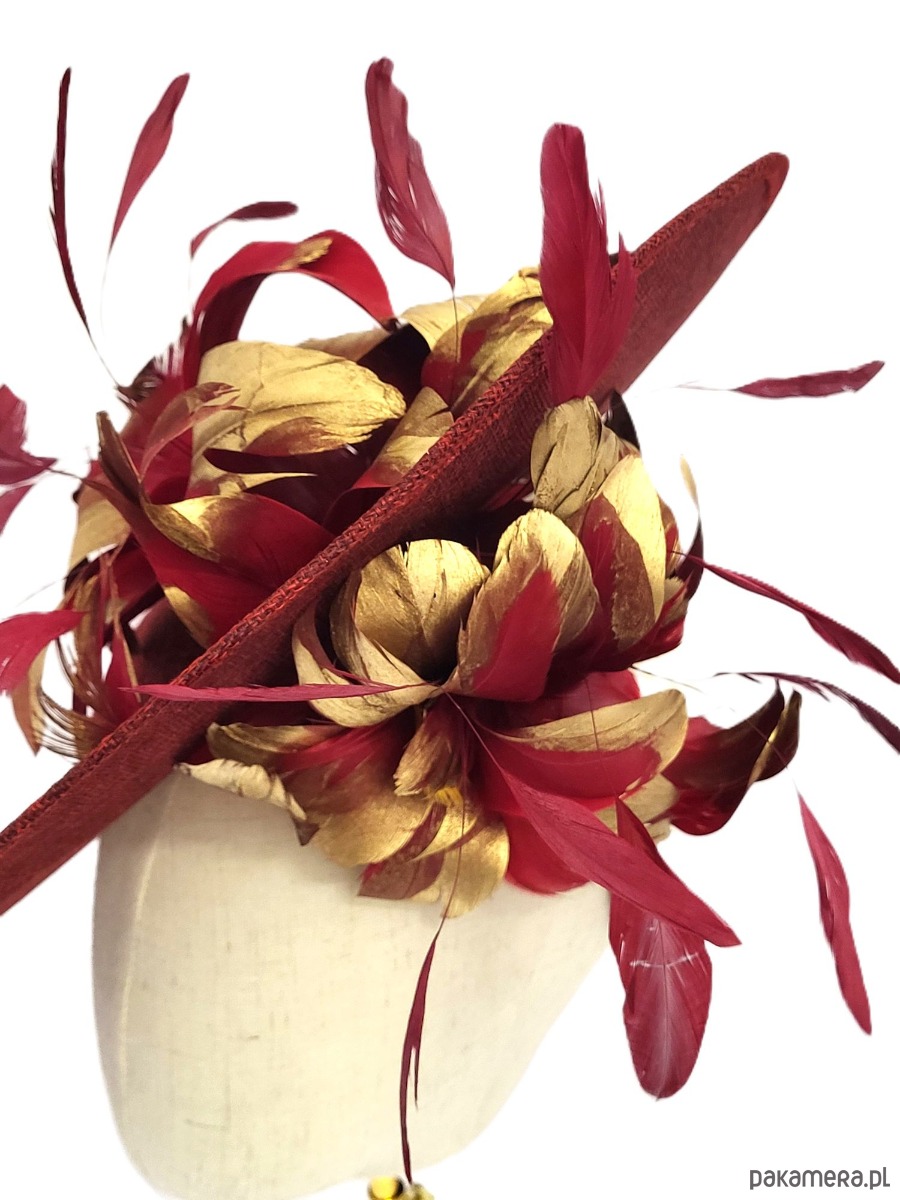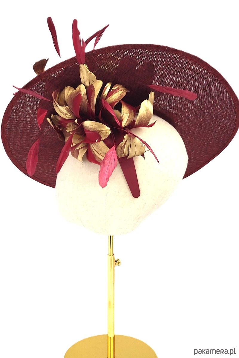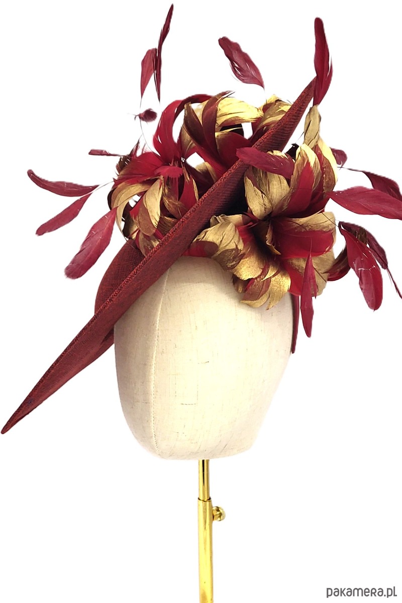 Spektakularna forma: Dynamicznie wyprofilowane rondo w głębokim odcieniu bordo stanowi idealną bazę dla kaskady dekoracyjnych piór. Hattinator średnica 40cm, noś na prawą stronę.