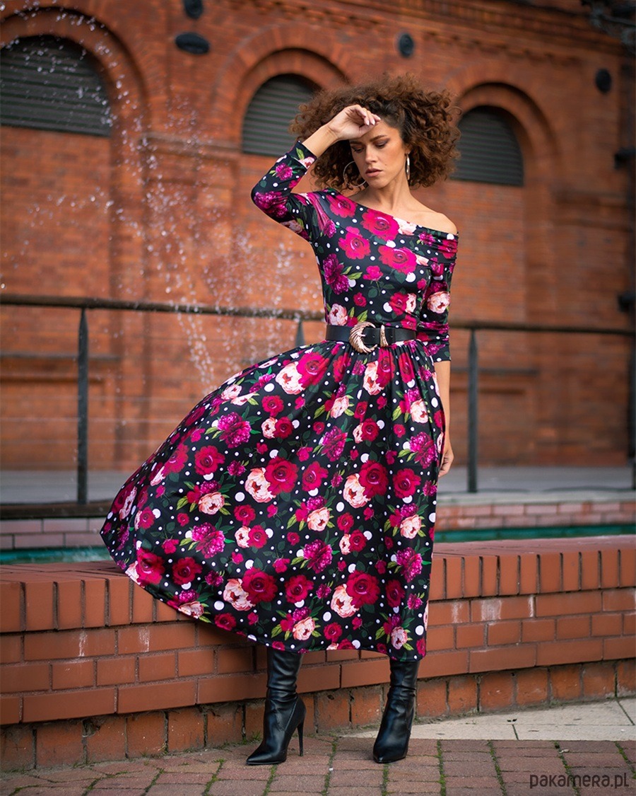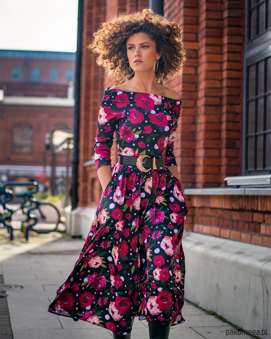 "Sandy" - rozkloszowana sukienka o deseniu w kwiaty i grochy, zaprojektowana tak, aby komplementować sylwetkę, podkreślając jej atuty w bardzo subtelny sposób. Jest jednocześnie elegancka, wygodna i ponadczasowa.