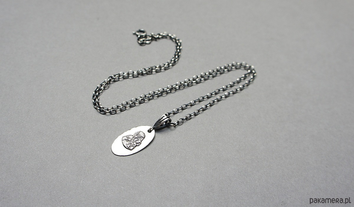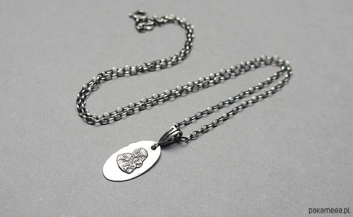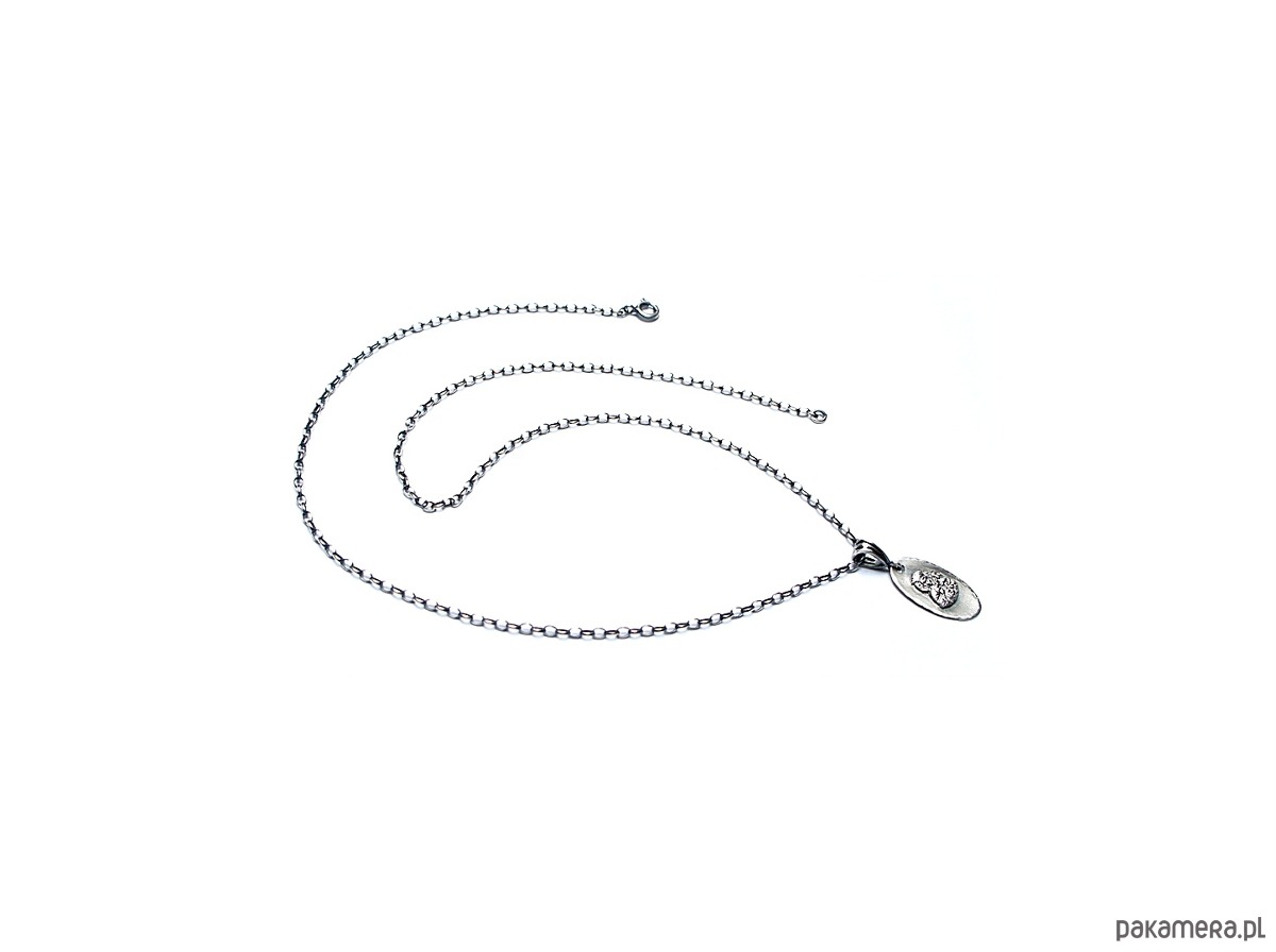 Naszyjnik wykonany własnoręcznie w całości ze srebra [pr. 925] . Wielkość blaszki [21mm x12mm]. Srebro oksydowane i przecierane. Całkowita długość naszyjnika 51,5cm. Biżuteria ozdobnie zapakowana. Do kompletu można dopasować kolczyki -dostępne w naszej galerii.