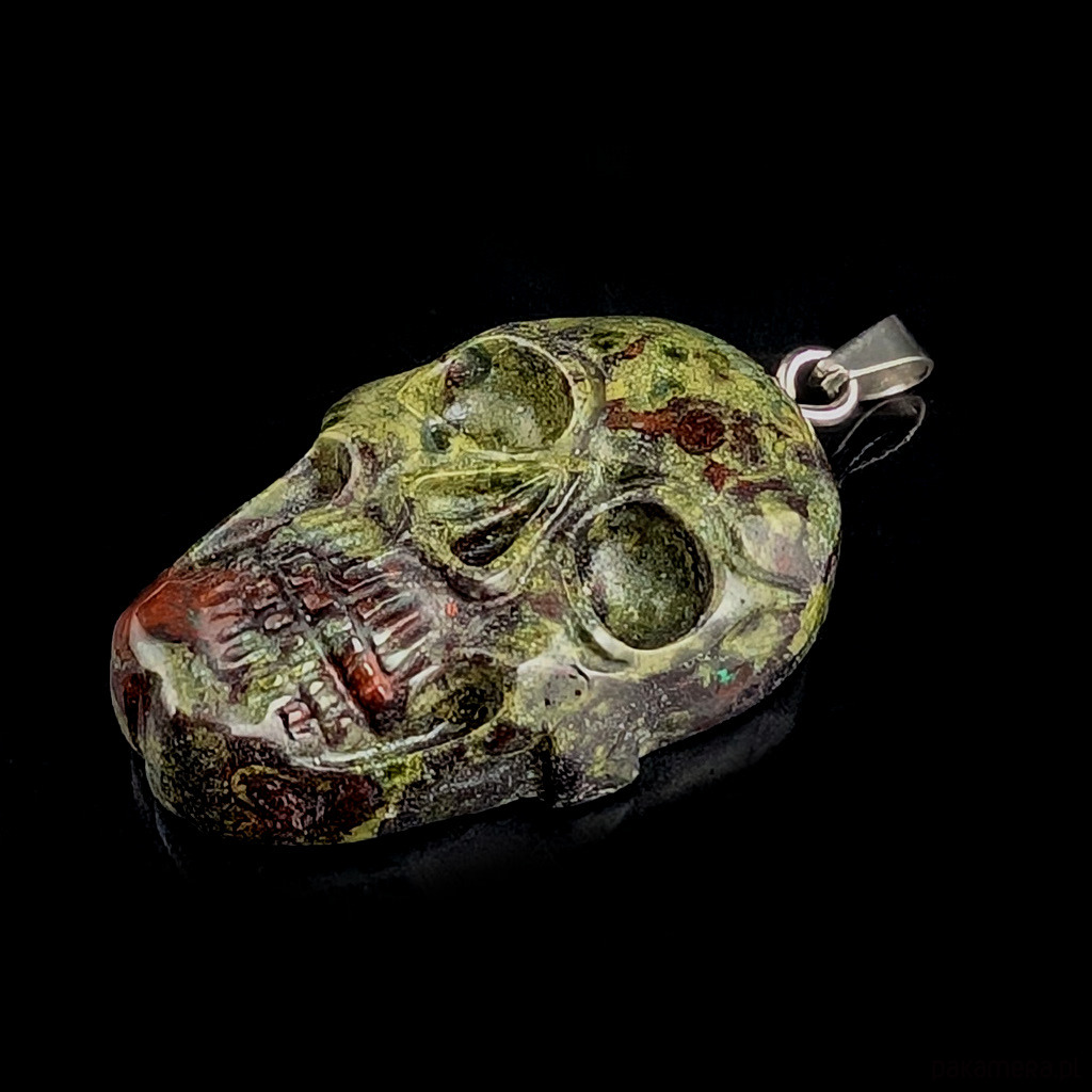 Oryginalny wisior z wyjątkowym jaspisem smoczym o ciekawym kształcie wyrzeźbionej czaszki. Kamień jest skałą składającą się z zielonego epidotu i czerwonego piemontytu. Krawatka srebro 925. Wymiary 35 x 22 mm, Waga 13 gramów.
