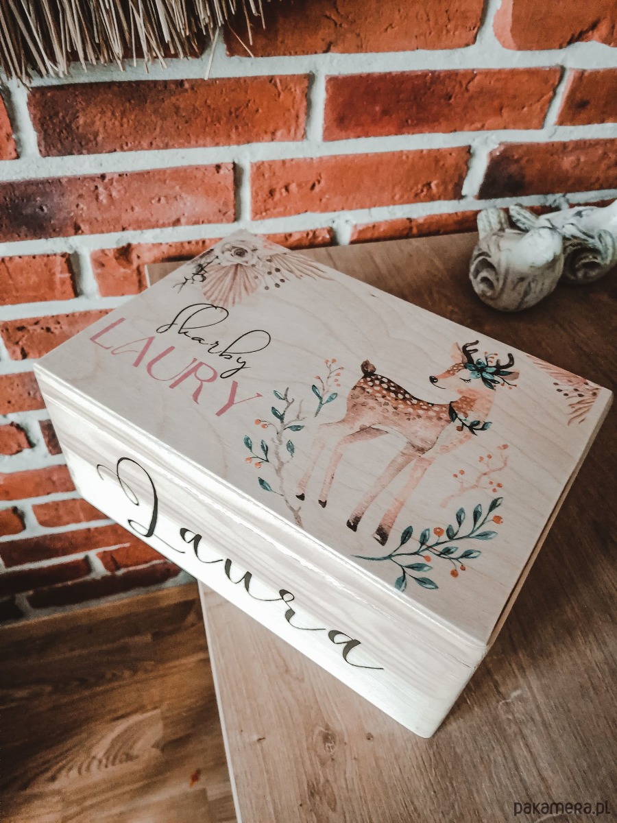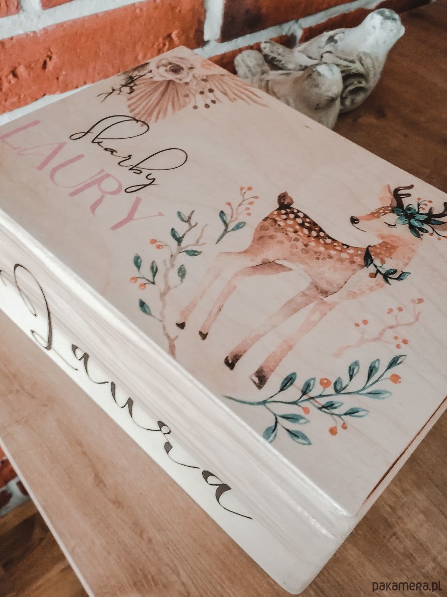 Na wieczku piękna grafika utrzymana w klimacie boho: sarenka oraz kwiaty i suszki. Na wieczku imię dziewczynki: może być samo imię lub napis np. Skarby, Pamiątki, Spinki, itp. Na froncie pudełeczka dodatkowo umieszczone imię dziewczynki, npaisane piękną kaligraficzną czcionką. Całość utrzymana w pastelach i beżach.