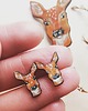 Lekkie kolczyki-sztyfty wykonane na podstawie autorskiego rysunku. Wycięte z drewna, ręcznie malowane i lakierowane. Każda para będzie niepowtarzalna. Wielkość ok 1,5cm. Sztyfty nie uczulą, bo są z silikonu!