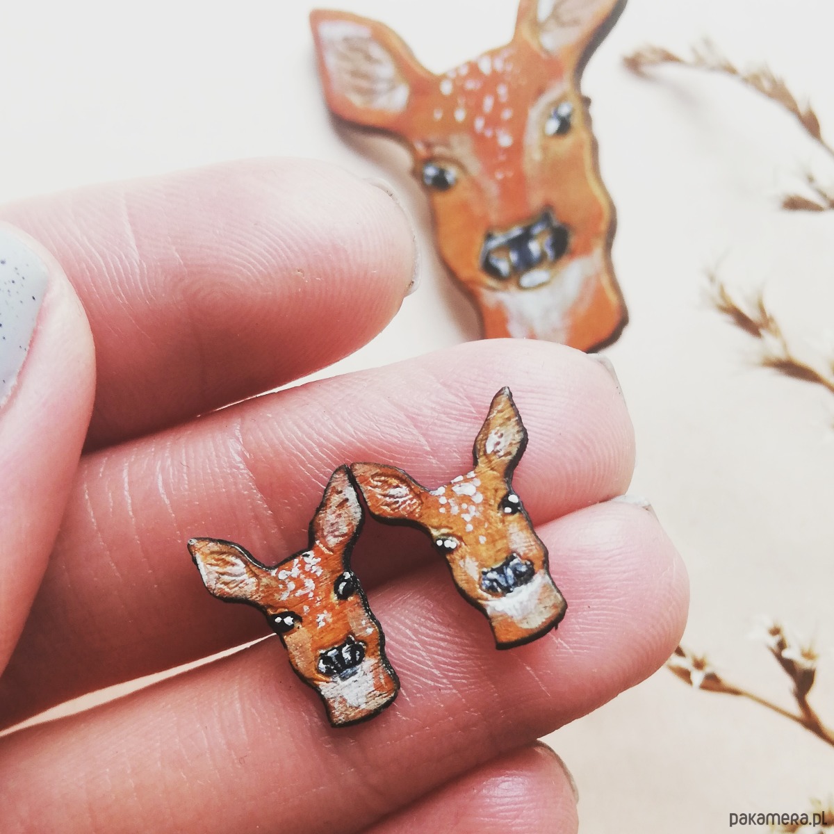 Lekkie kolczyki-sztyfty wykonane na podstawie autorskiego rysunku. Wycięte z drewna, ręcznie malowane i lakierowane. Każda para będzie niepowtarzalna. Wielkość ok 1,5cm. Sztyfty nie uczulą, bo są z silikonu!