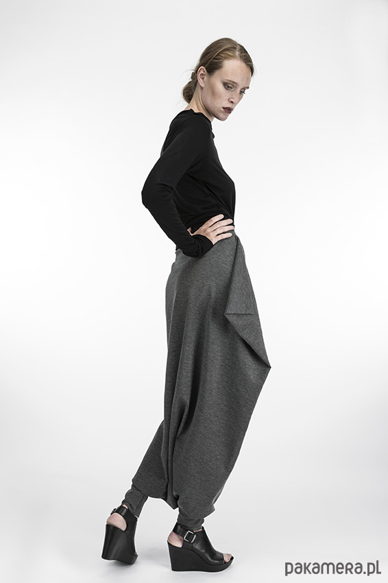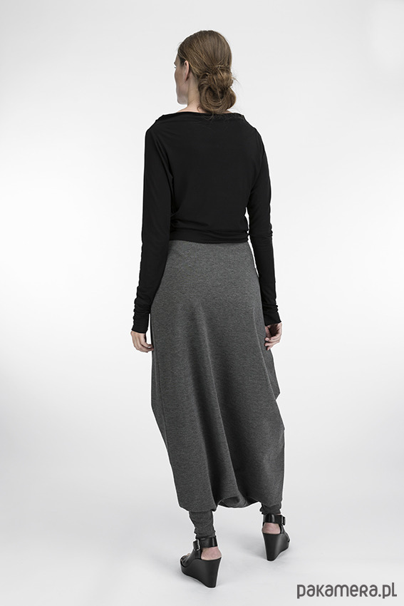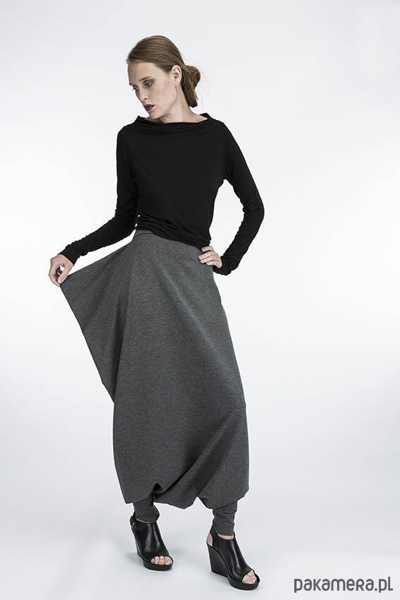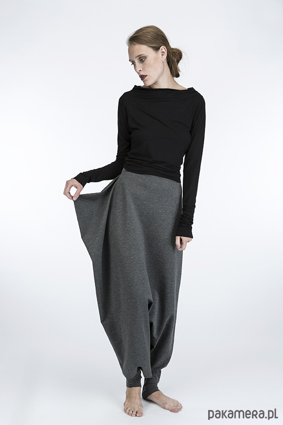Stylowe spodnie o linii sarouel, uszyte z grubszej, elastycznej dzianiny (70% wiskoza, 22% nylon, 8% elastan),