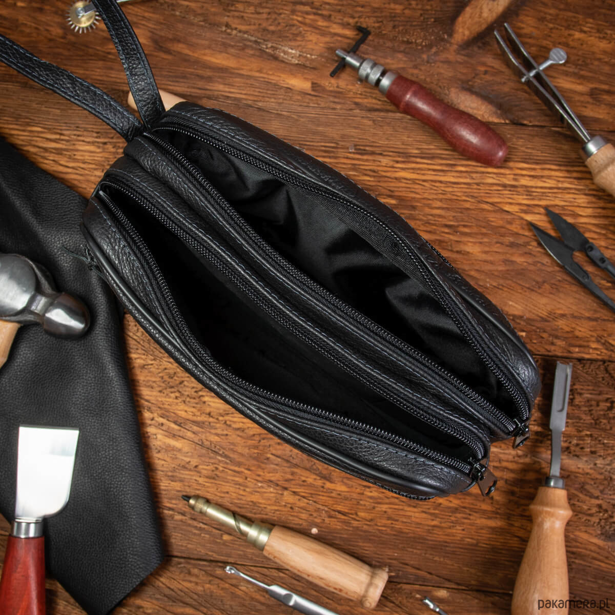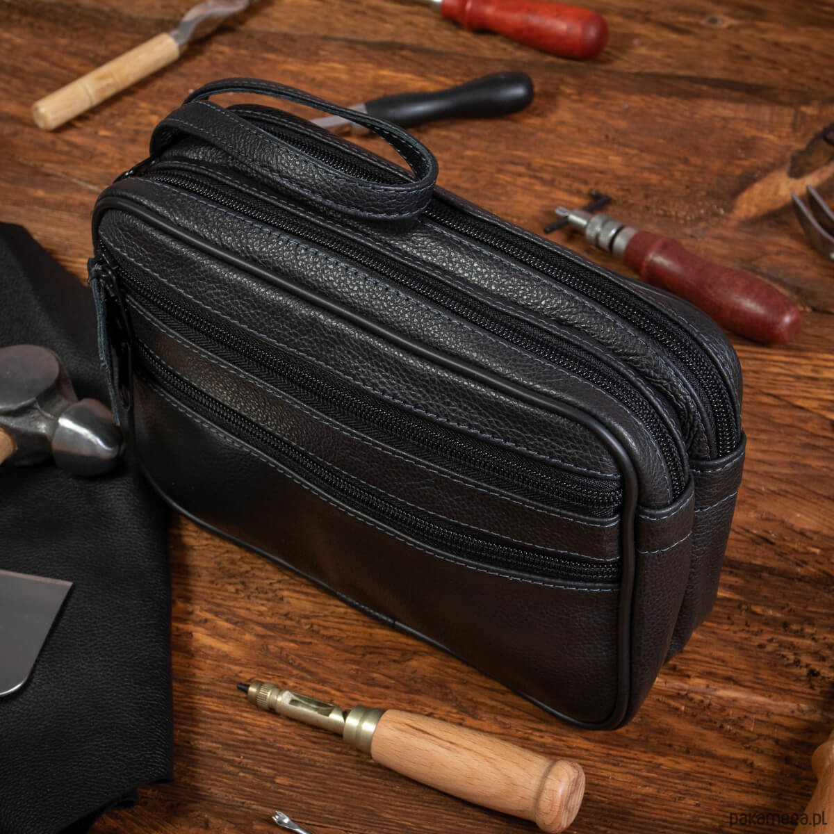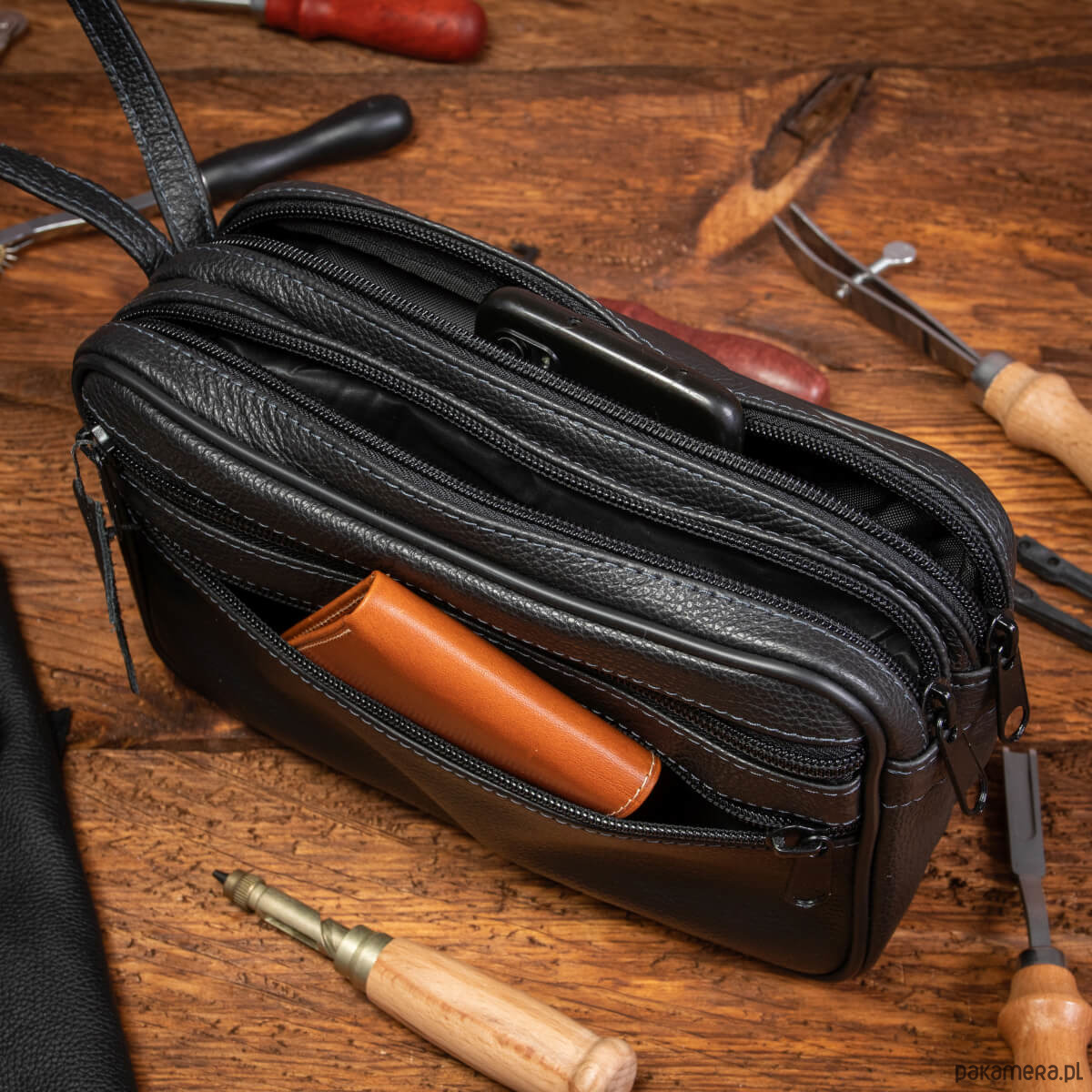 - saszetka z paskiem do ręki (pasek jest na stałe wszyty w korpus saszetki)
