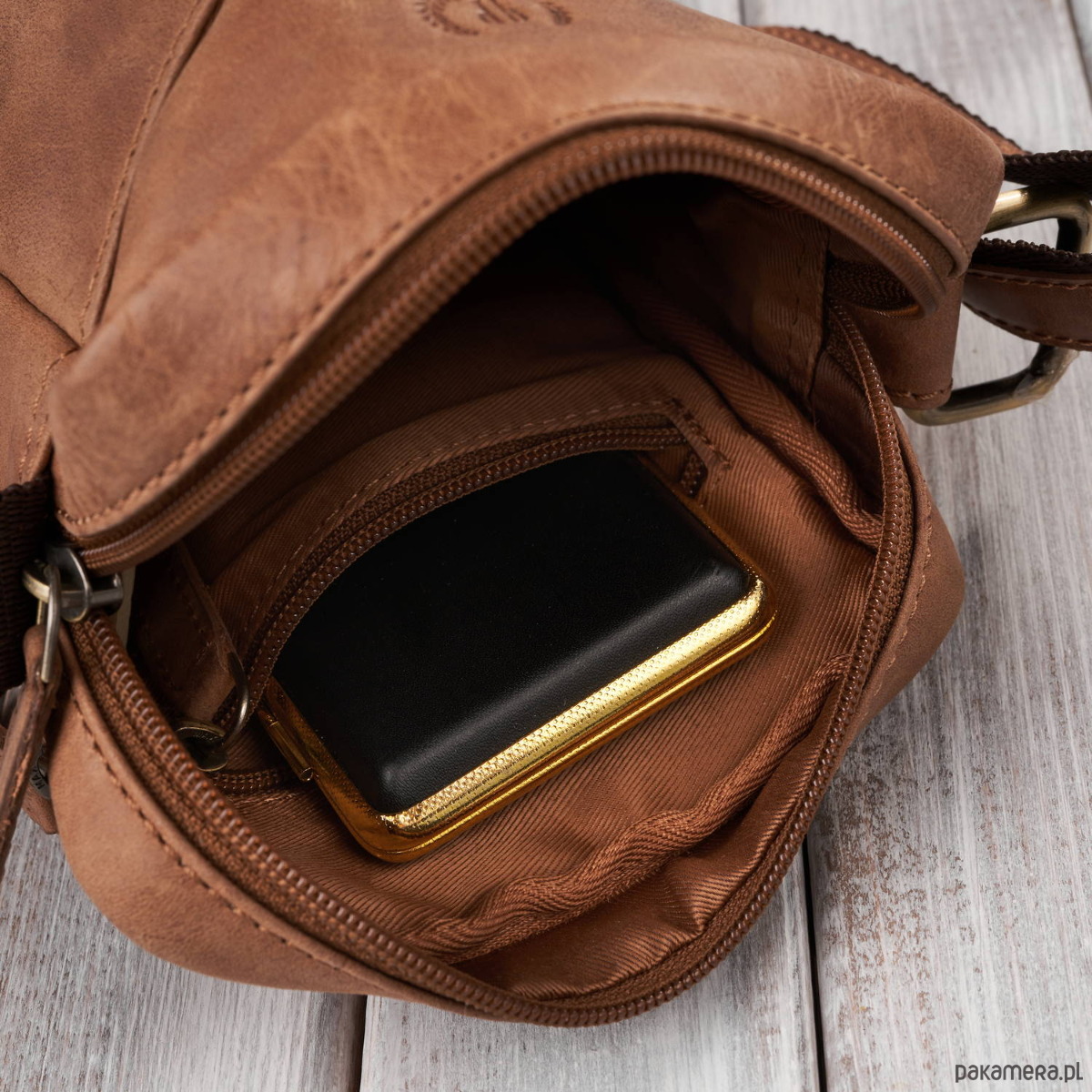 ➤ Komora główna saszetki na ramię zapinana jest na zamek błyskawiczny. Wewnątrz komory znajdują się dodatkowe dwie kieszonki: jedna kieszeń na zamek, druga kieszeń wsuwka z przeznaczeniem na telefon.