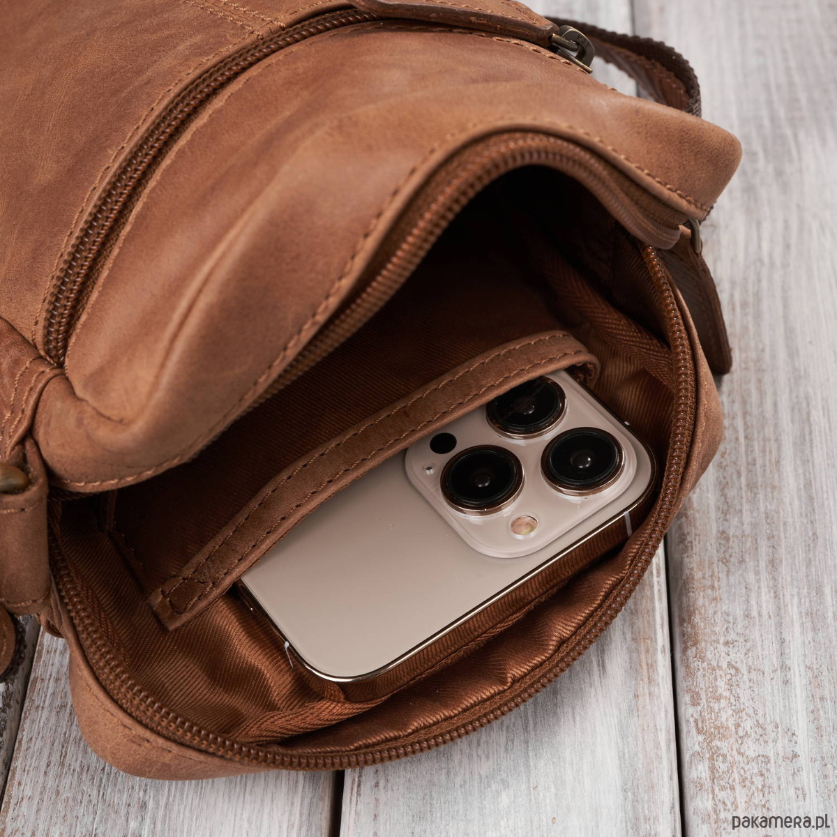 ➤ Produkt uszyto ze skóry naturalnej w kolorze koniakowym.