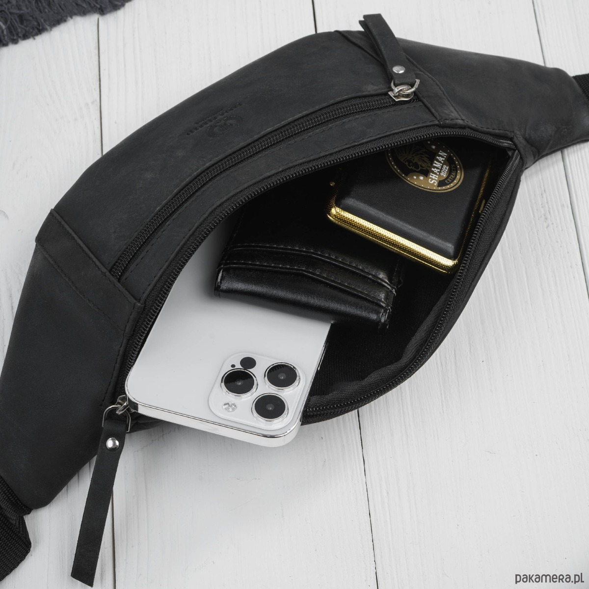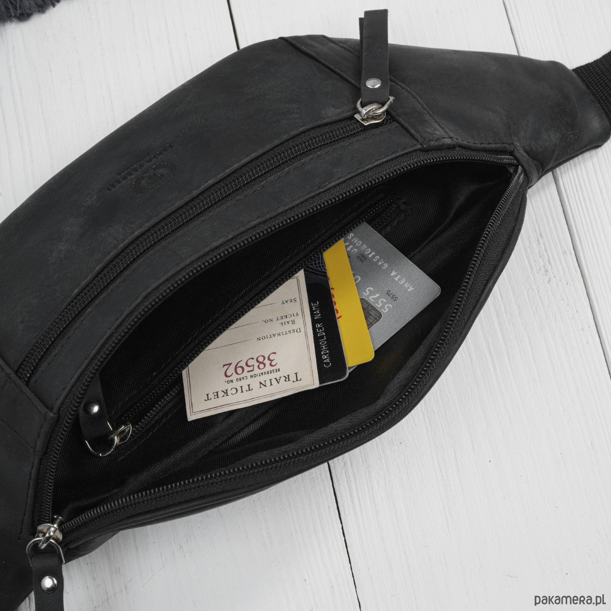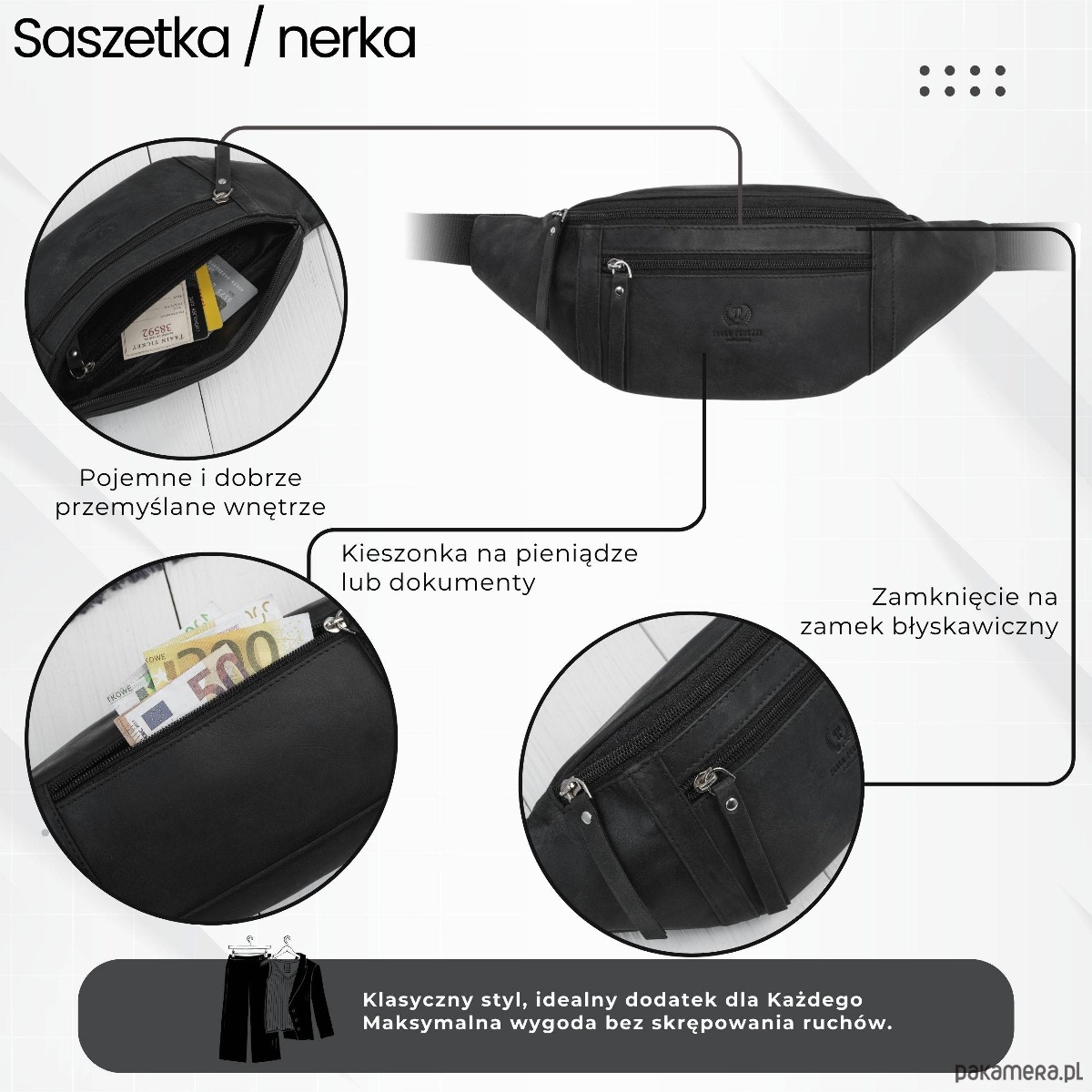 Główna komora pomieści telefon, portfel i klucze, a dodatkowa kieszeń frontowa na zamek pozwala wygodnie zorganizować drobniejsze przedmioty. Całość uzupełnia regulowany pasek oraz mocne, metalowe zamki, które gwarantują trwałość podczas wielu lat użytkowania.